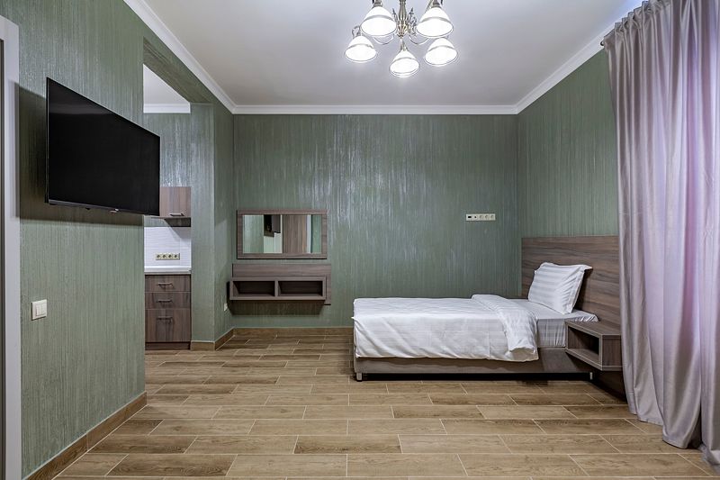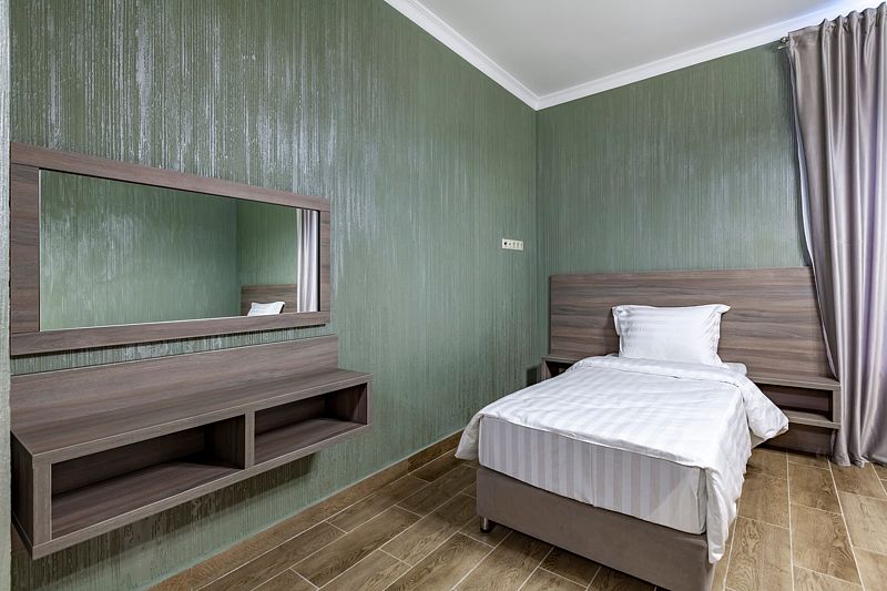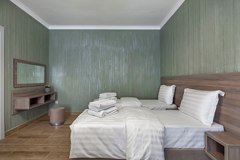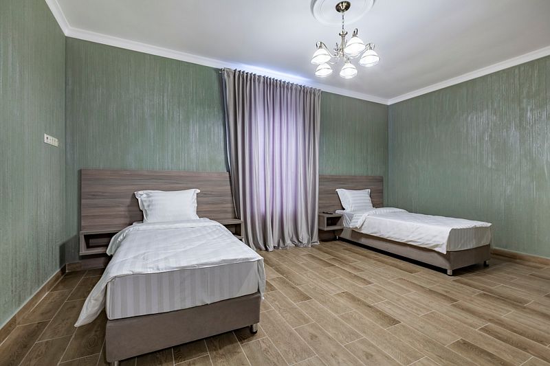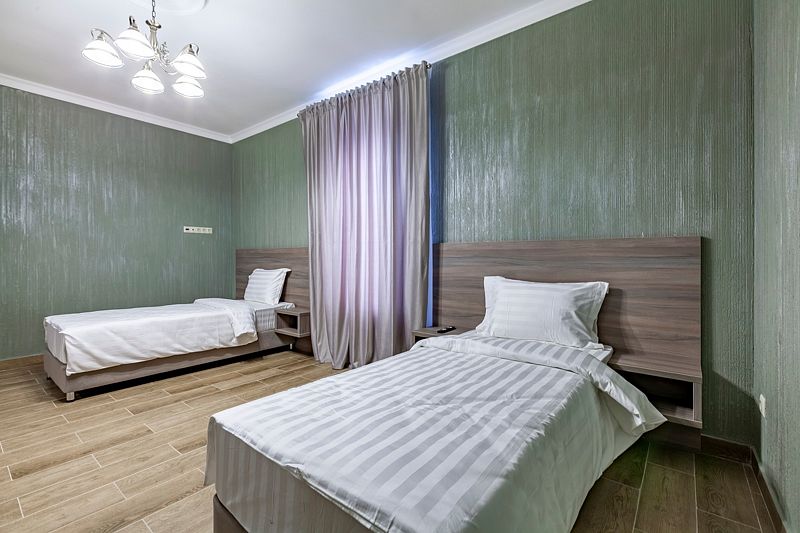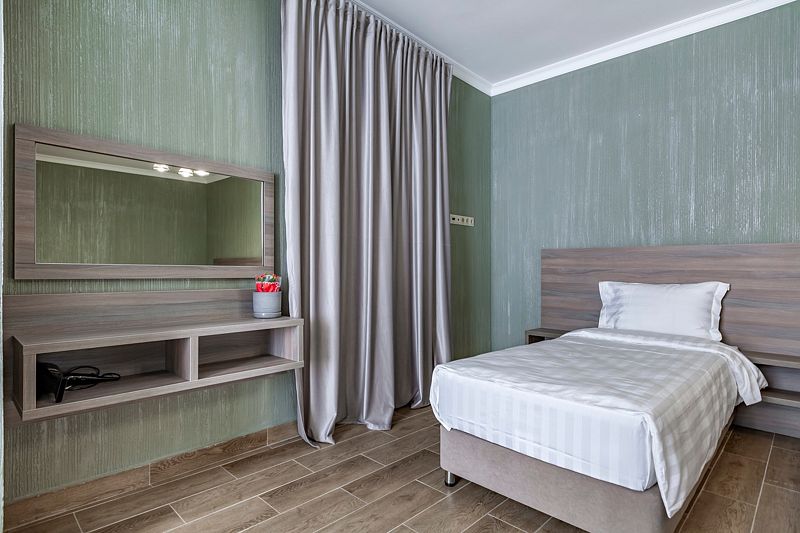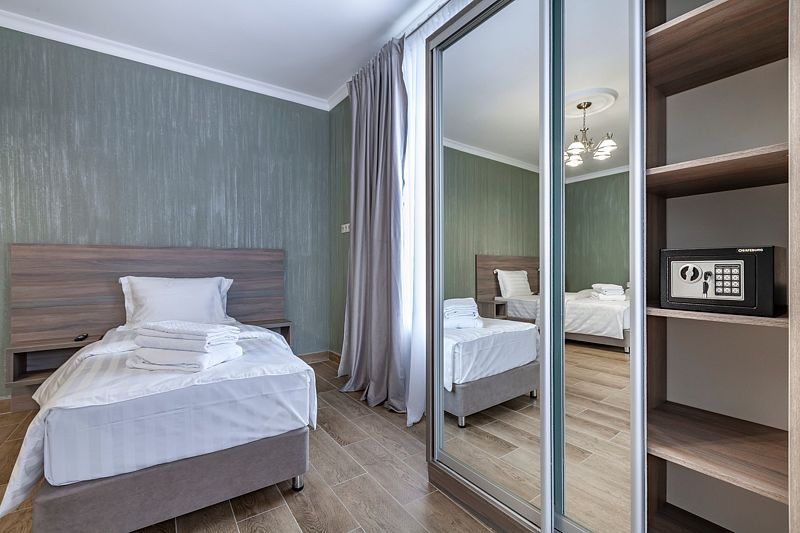 В номере: две односпальные кровати. Имеется мини-кухня, посуда, телевизор, кондиционер, вентилятор, шкаф, вешалка, стол, стулья, чайник и холодильник. Индивидуальная ванная комната: душ, раковина, туалет, халат, тапочки, фен, утюг, гладильная доска, шампунь.