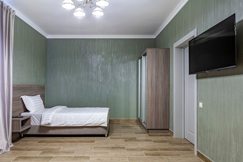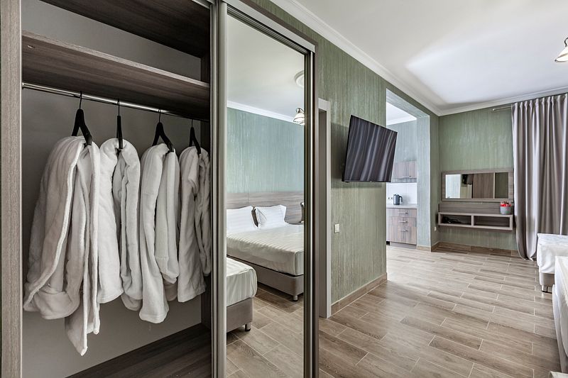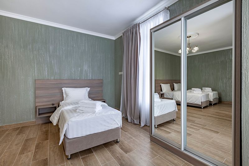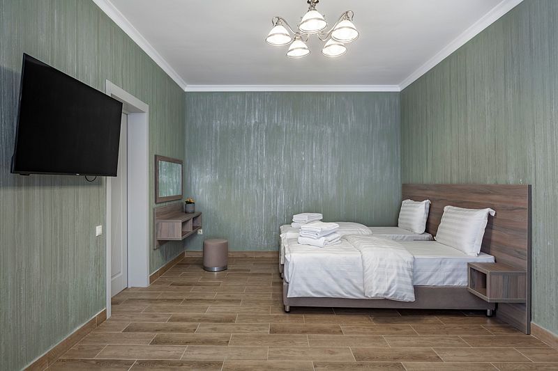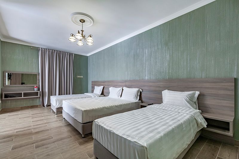 В номере: три односпальные кровати. Имеется мини-кухня, посуда, телевизор, кондиционер, вентилятор, шкаф, вешалка, стол, стулья, чайник и холодильник. Индивидуальная ванная комната: душ, раковина, туалет, халат тапочки, фен, утюг, гладильная доска, шампунь.