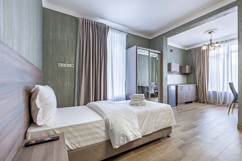 Студия стандарт площадью тридцать восемь квадратных метров с видом во двор. Подходит для размещения трех человек (два основных места и одно дополнительное). Имеет спальню с приятным интерьером.