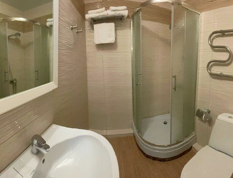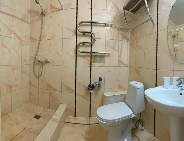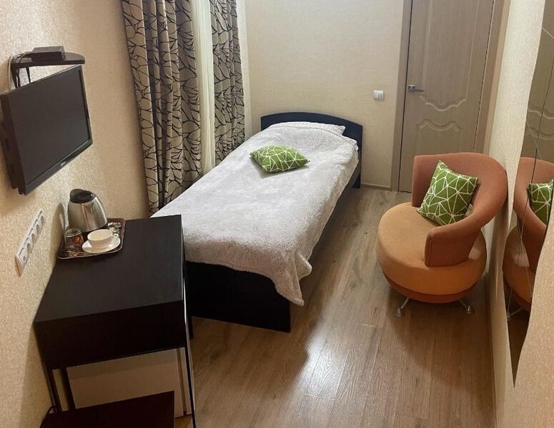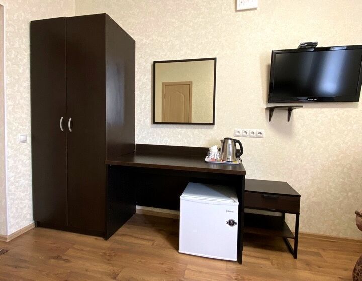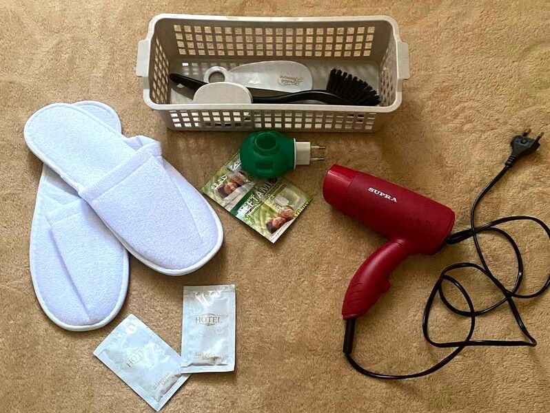 Без изысков, чистенько. Чайник, холодильник, тапочки, шампунь.