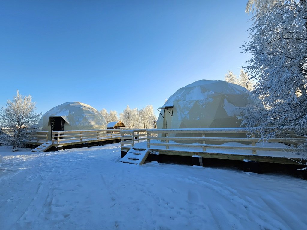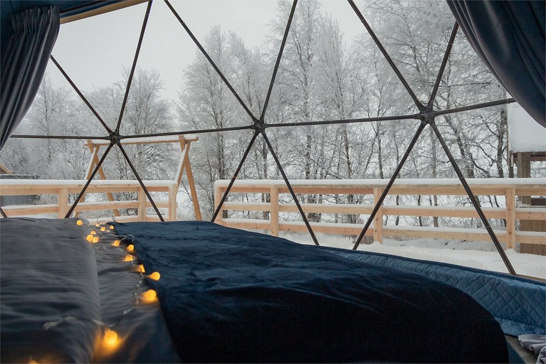Размещение в комфортабельной круглогодичной сфере с потрясающим видом из панорамного окна и дизайнерским интерьером. Конструкция модуля выполнена в виде полусферы без единого угла. Это подарит ощущение объемного пространства и большого количества света! Интерьер Геокупола «Зима» выполнен в стиле «Морозной Арктики», создающий неповторимую атмосферу загадочности и волшебства Севера. Насладитесь уникальным зрелищем, северным сиянием, прямо из вашего уютного геокупола, и погрузитесь в волшебную атмосферу зимнего путешествия. Пространство внутри купола не имеет перегородок и позволяет перемещаться внутри по кругу. У сферы есть собственная деревянная терраса с видом на озеро, на которой расположены кресла и столик, вечером можно включить декоративную подсветку в виде гирлянды. На территории глэмпинга – BBQ-зона у каждого геокупола, качели, общий пирс.Услуги и удобства