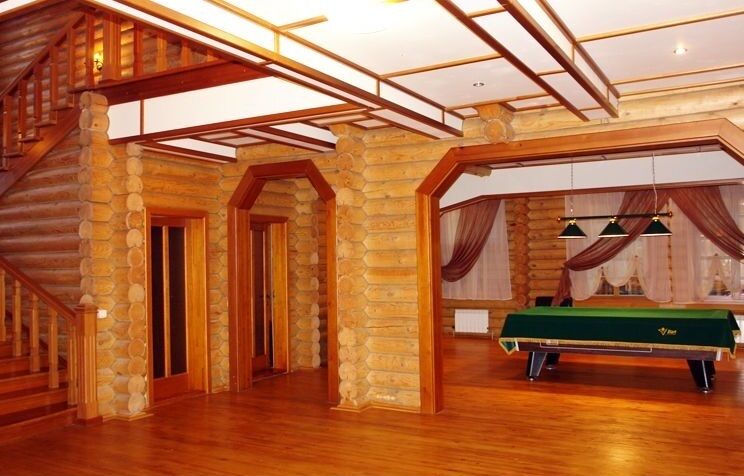 1-й этаж – просторный холл, в центре которого широкая деревянная лестница, ведущая на второй этаж. Красивые арки под потолком отделяют холл от других помещений. Это: банкетный зал, бильярдная, кинозал, кухня, прачечная, санузел, оборудованные в соответствие с предназначением. С первого этажа имеется спуск в подвал, который выполняет роль технического помещения. Здесь находятся фильтр и титан для подогрева воды на 200 литров..