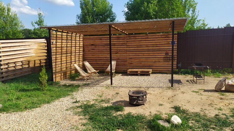 Во дворе оборудована мангальная зона, обустроена костровая чаша, имеется уютная беседка и терраса — все для того, чтобы гости могли в полной мере насладиться отдыхом на природе.
