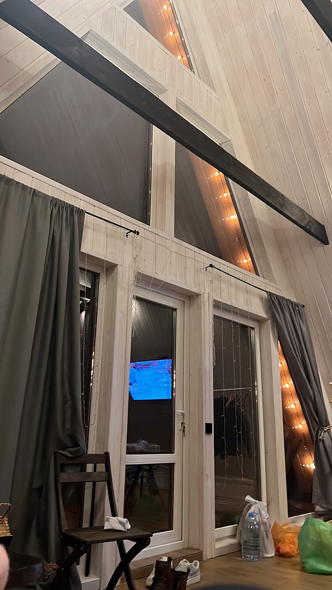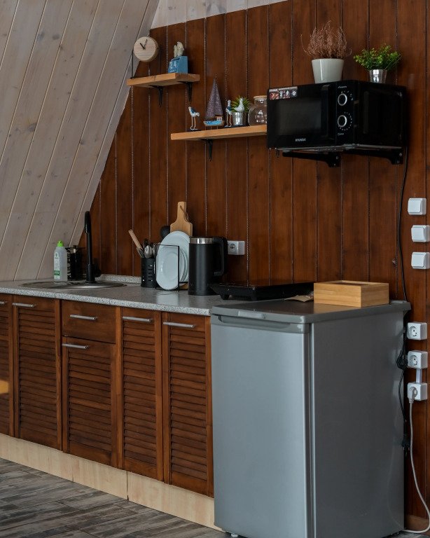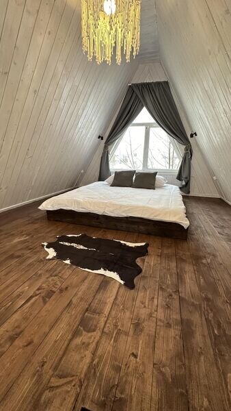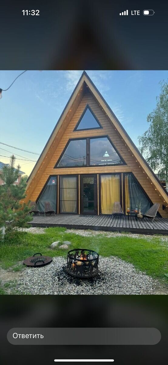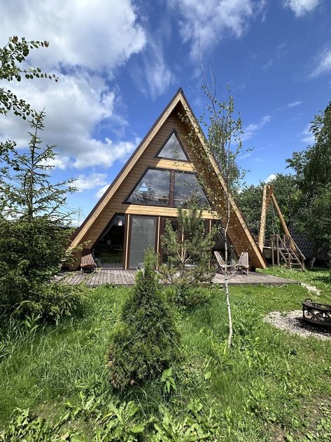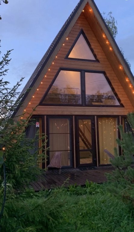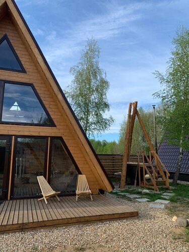 Новый А-фрейм треугольный дом для отдыха большой семьей или компанией до шести человек. У дома сибирский банный чан. Предоставляются: полотенца, шампунь, гель для душа, мыло, губки, тапочки, фен, посуда, микроволновая печь, чайник, набор чаёв, кофе, холодильник, индукционная плита, постельное белье, соль, сахар, масло.