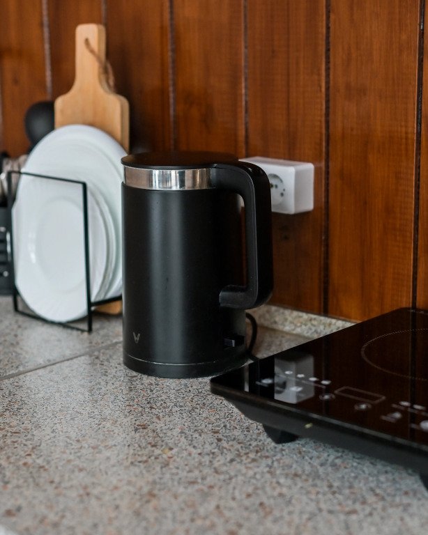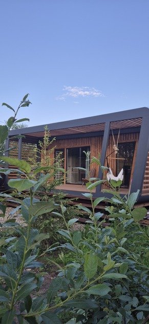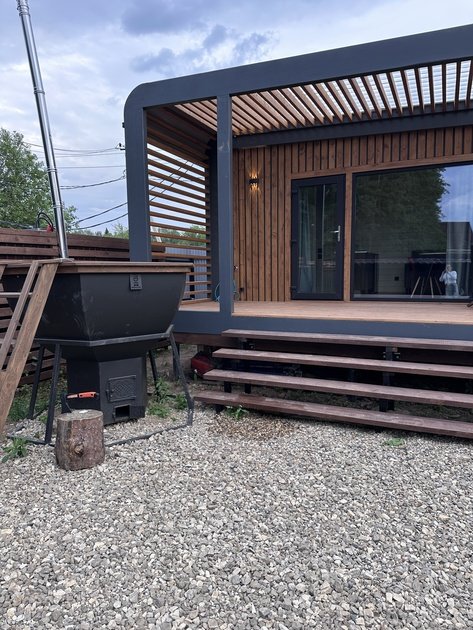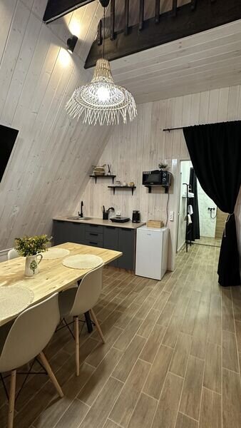 Внутри дома есть все необходимое для комфортного пребывания: гости могут пользоваться оборудованной кухней и микроволновой печью, чтобы самостоятельно готовить пищу. А за пределами уютного жилища их ждет замечательная зона для барбекю и костра, где можно с комфортом насладиться приготовлением аппетитных блюд на открытом огне. Рядом расположены удобные шезлонги под навесом, позволяющие расслабиться и любоваться живописными окрестностями.