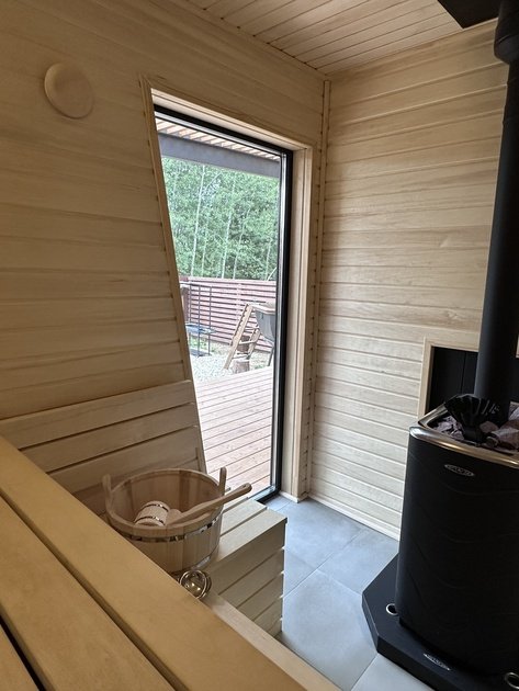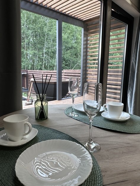 В доме раскладной удобный диван, панорамное остекление с видом на лес. В доме прекрасная дровяная баня с панорамным окном с видом на лес. У большой крытой террасы сибирский чан. Мангальная зона с шампурами (угли и розжиг для мангала гости привозят самостоятельно).