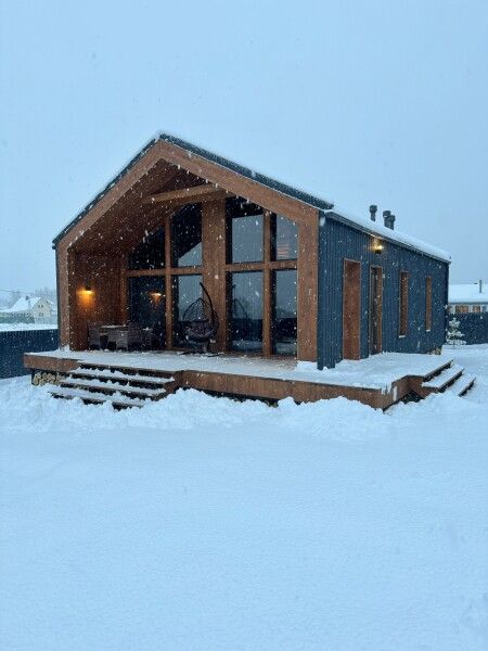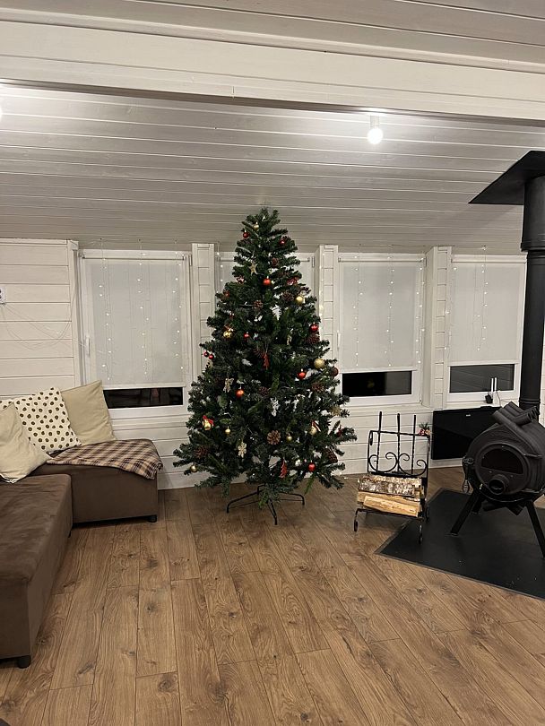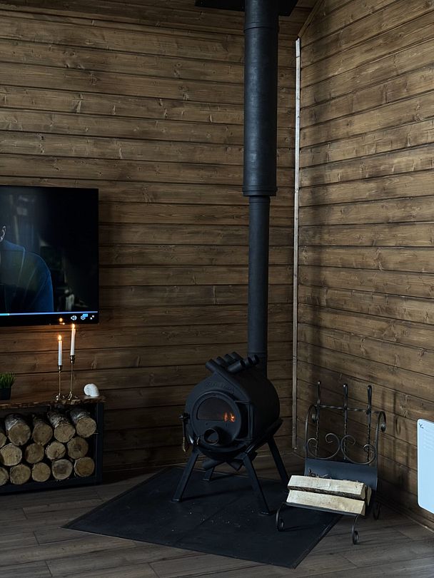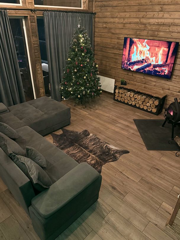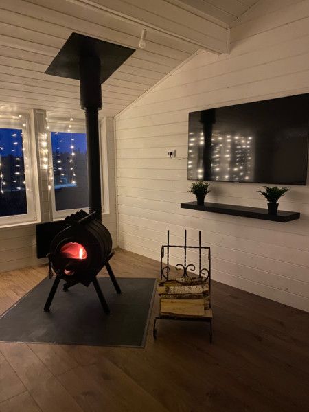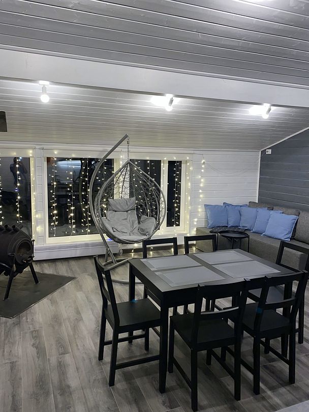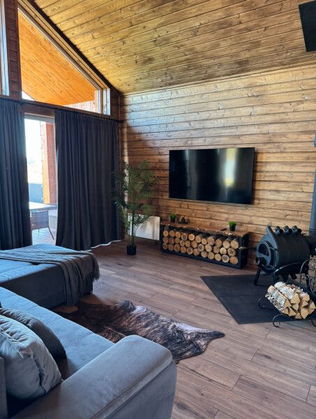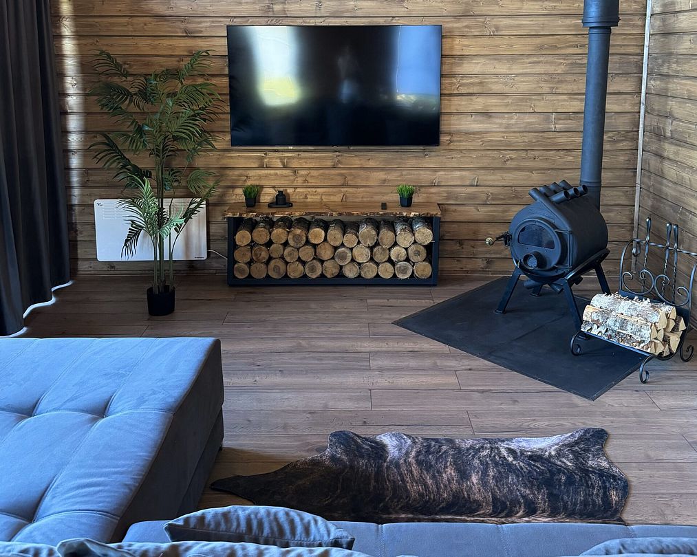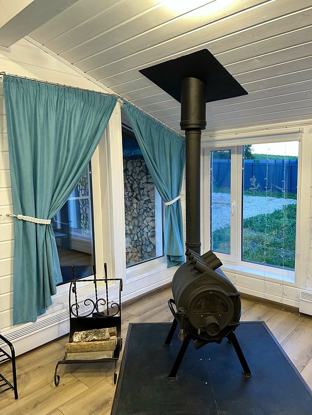Во всем доме панорамные окна, полностью оборудованная кухня, WiFi, печь-камин (дрова — бесплатно), телевизор Smart TV, проектор, кондиционер, кабинет с рабочей зоной, санузел, сушильная и стиральная машина.
