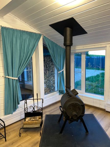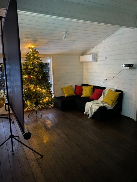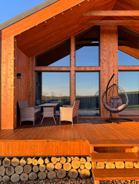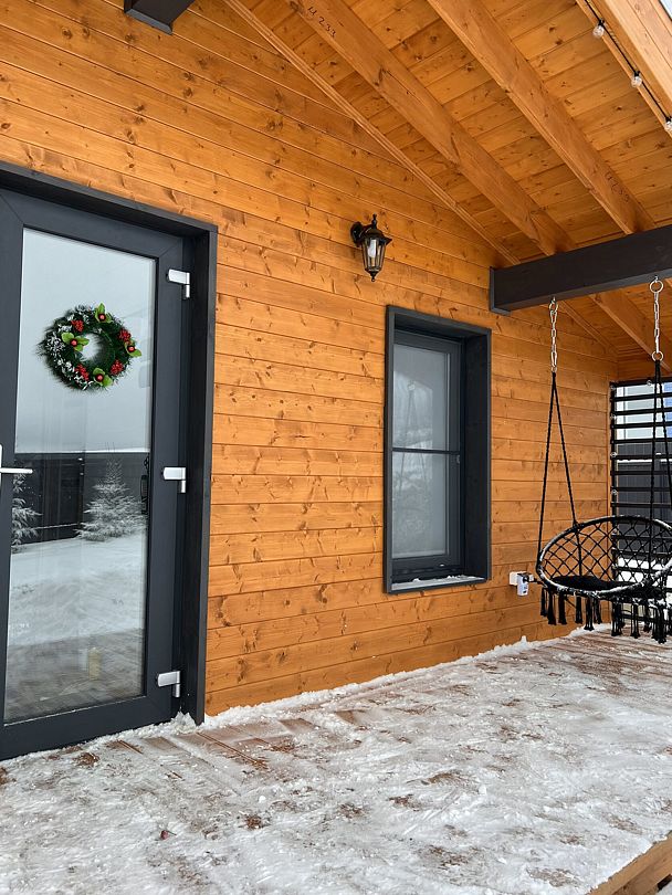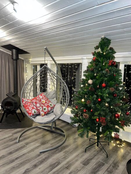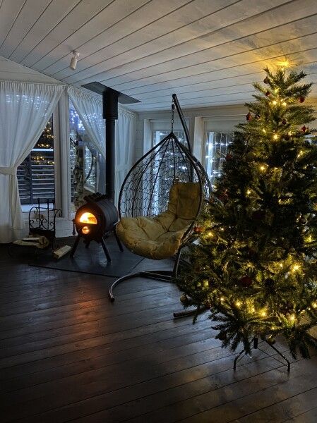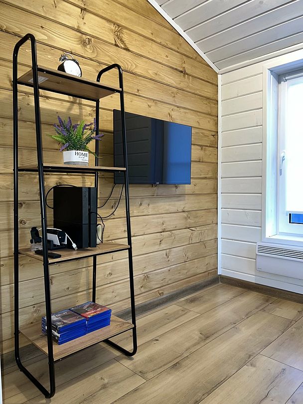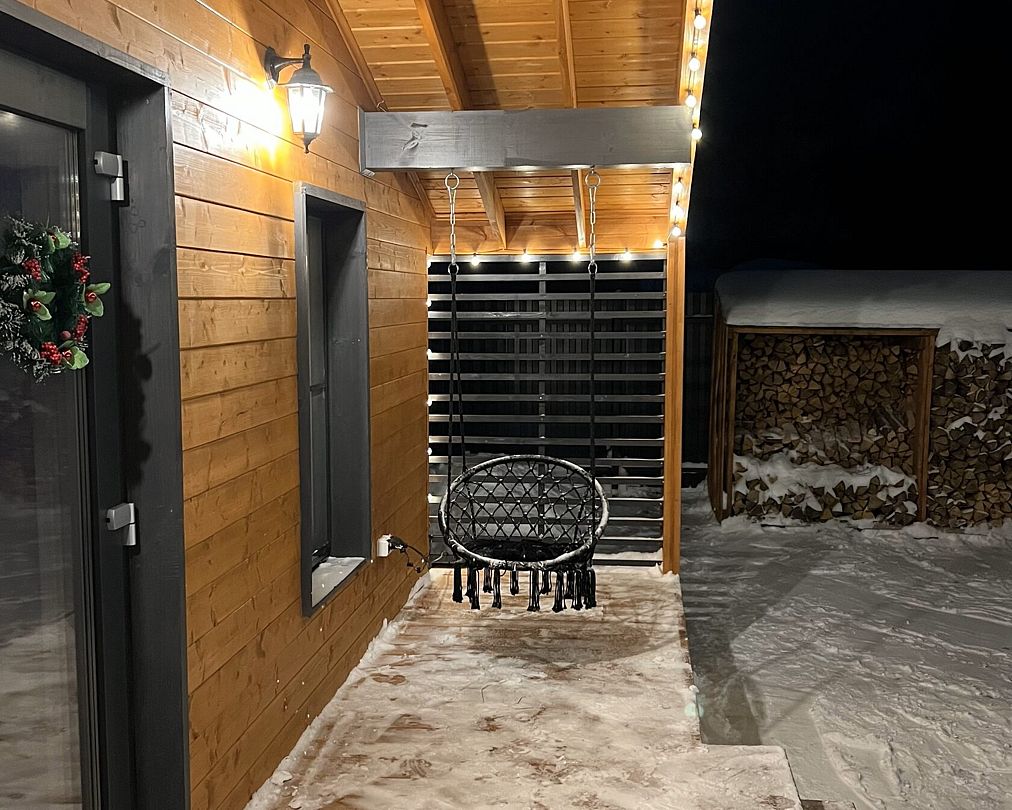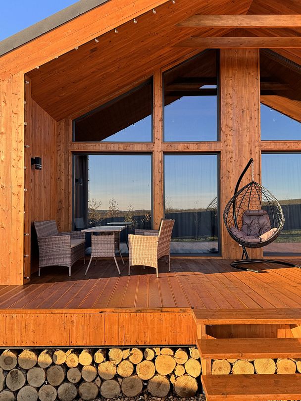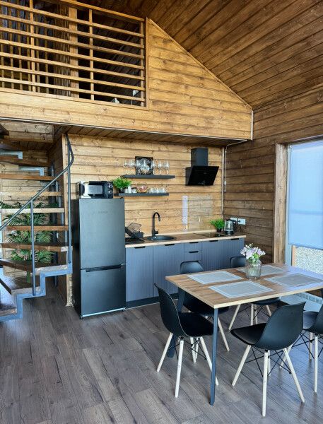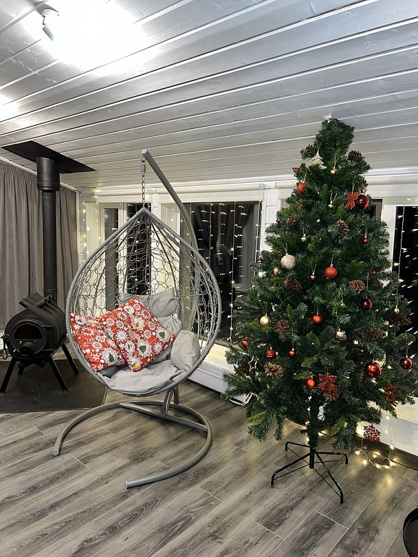 Во всем доме панорамные окна, полностью оборудованная кухня, WiFi, печь-камин (дрова — бесплатно), телевизор Smart TV, проектор, кондиционер, кабинет с рабочей зоной, санузел, сушильная и стиральная машина.