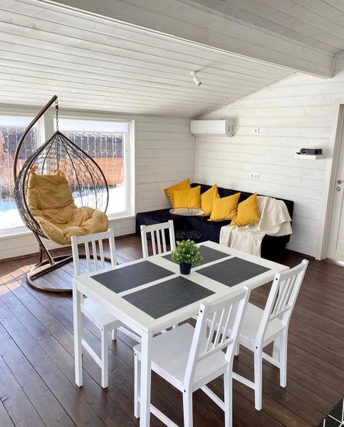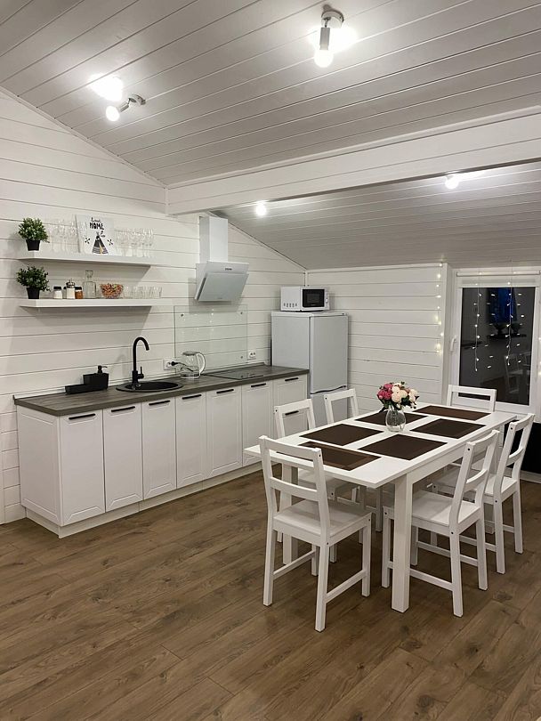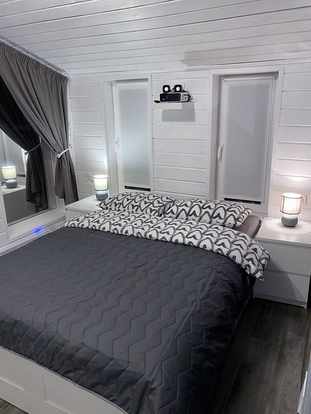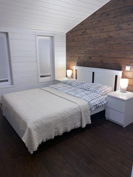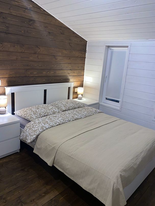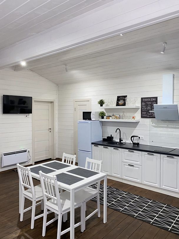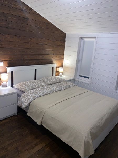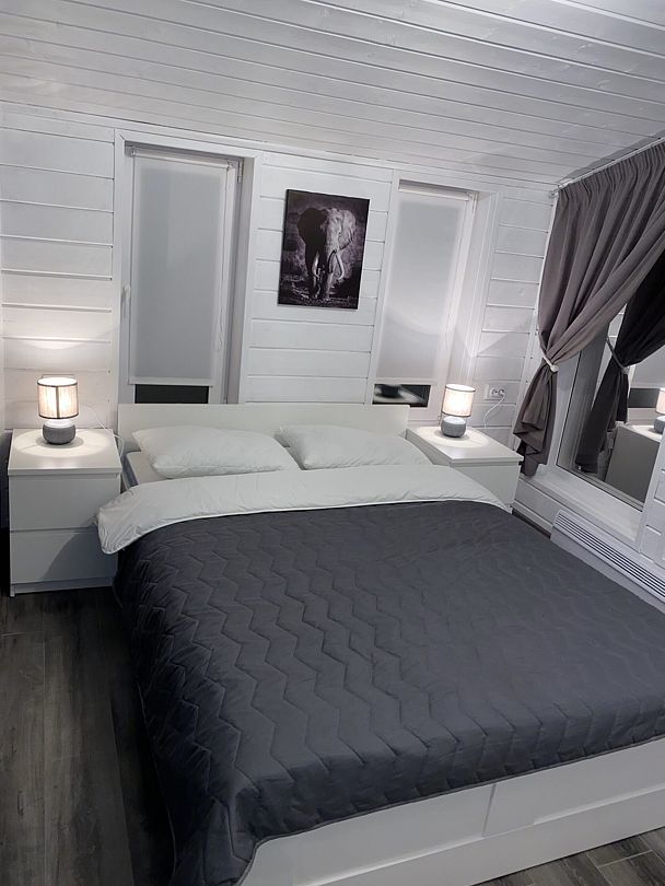 В доме доме с русской баней современный ремонт и приятный интерьер светлых оттенков. Вмещает до 6 взрослых и одного ребенка до 3 лет. Имеются две отдельные спальни с двухспальными кроватями и детской кроваткой. В гостиной есть угловой раскладной диван. В кабинете небольшой раскладной диван.