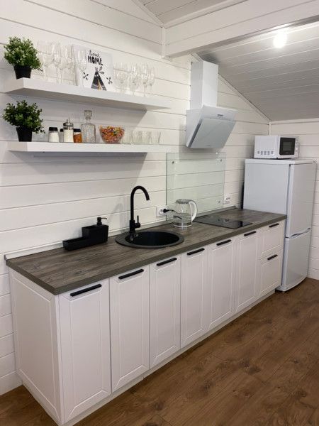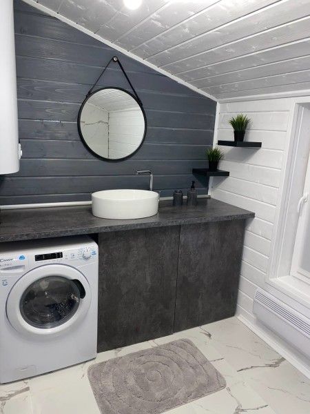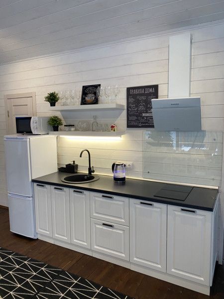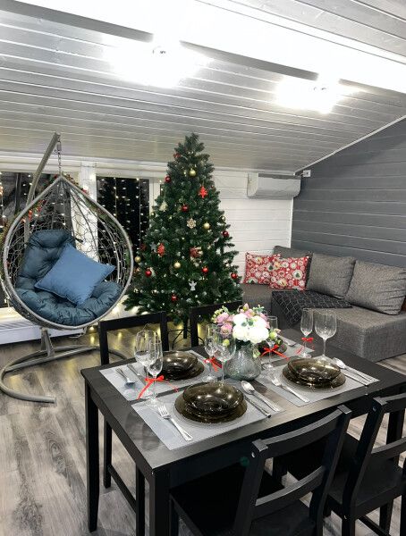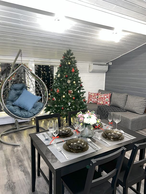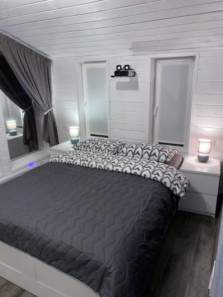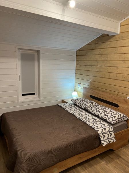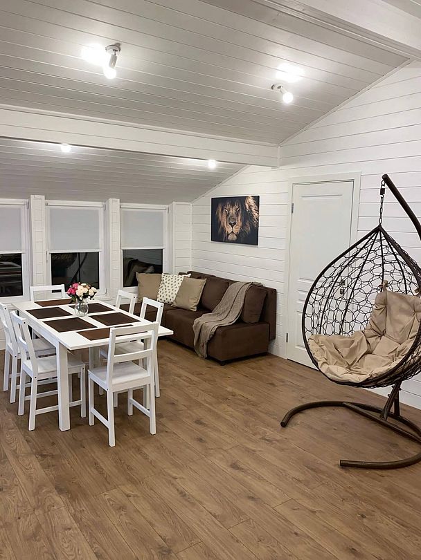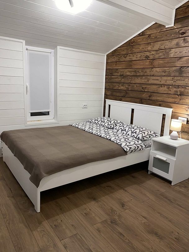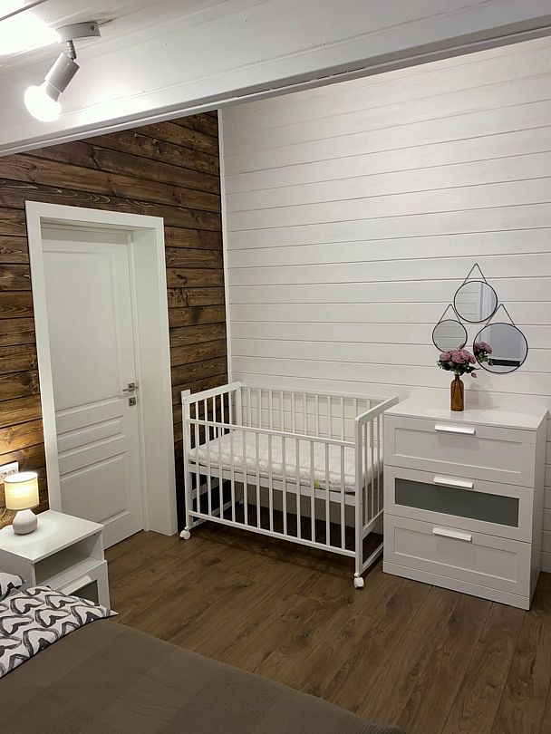 В доме доме с русской баней современный ремонт и приятный интерьер светлых оттенков. Вмещает до 6 взрослых и одного ребенка до 3 лет. Имеются две отдельные спальни с двухспальными кроватями и детской кроваткой. В гостиной есть угловой раскладной диван. В кабинете небольшой раскладной диван.