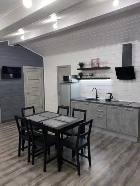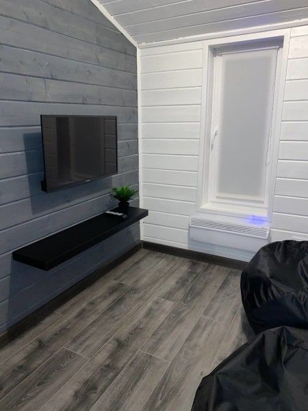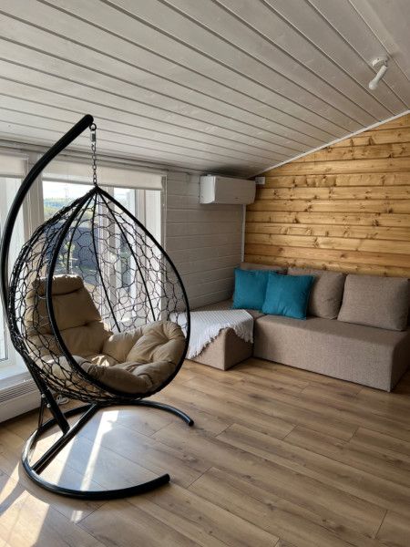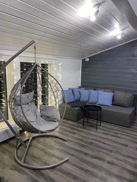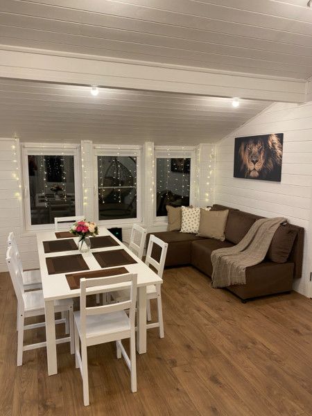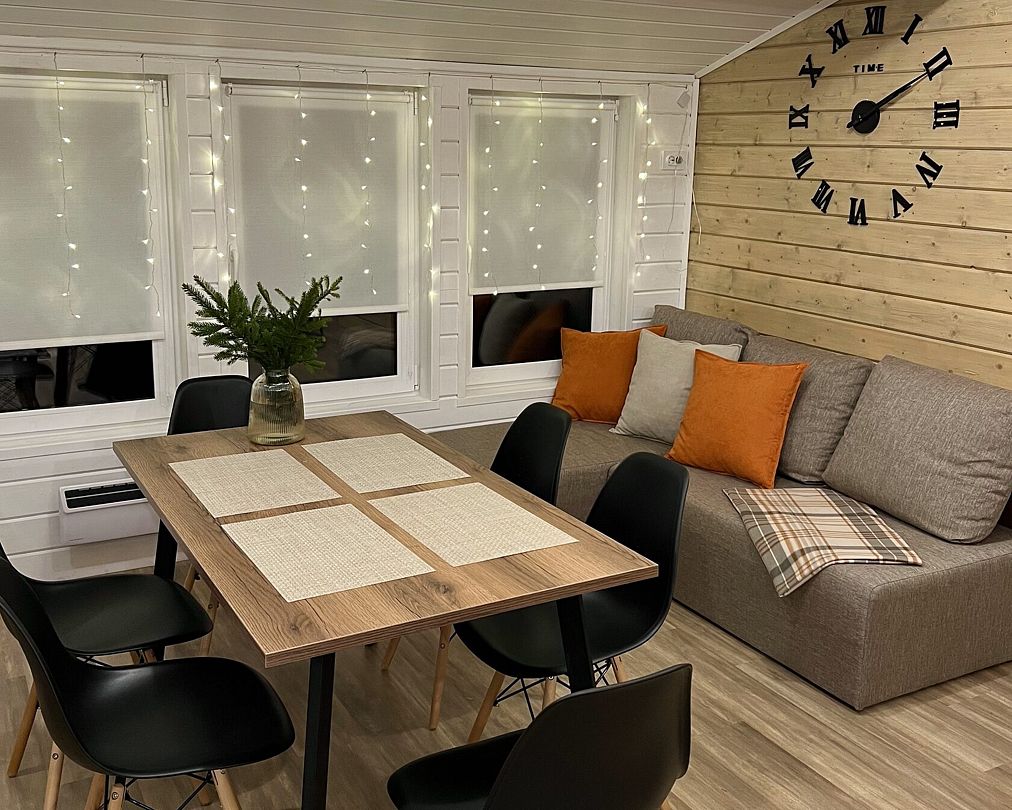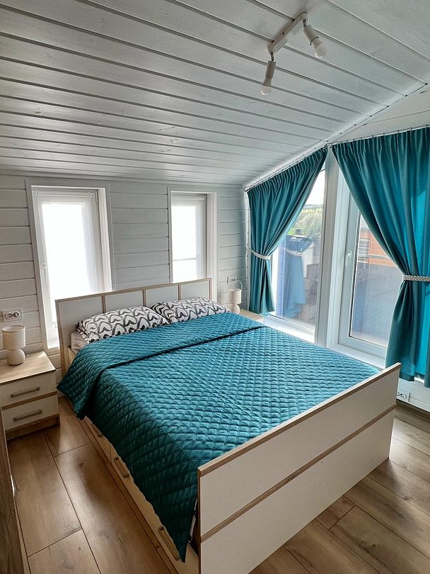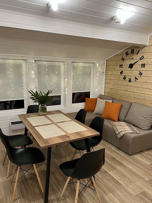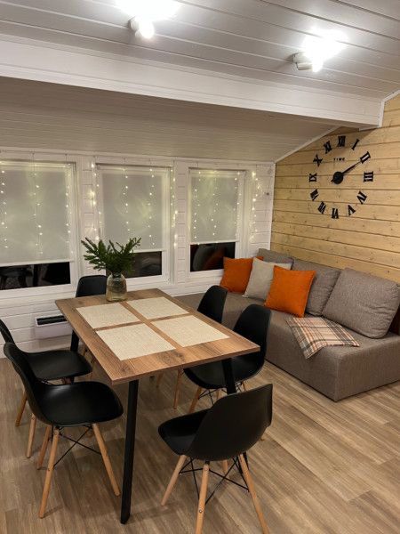 В доме доме с русской баней современный ремонт и приятный интерьер светлых оттенков. Вмещает до 6 взрослых. Имеются две отдельные спальни с двухспальными кроватями и детской кроваткой. В гостиной есть угловой раскладной диван. В кабинете не большой раскладной диван.
