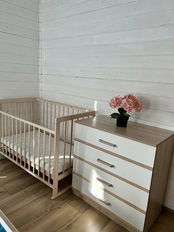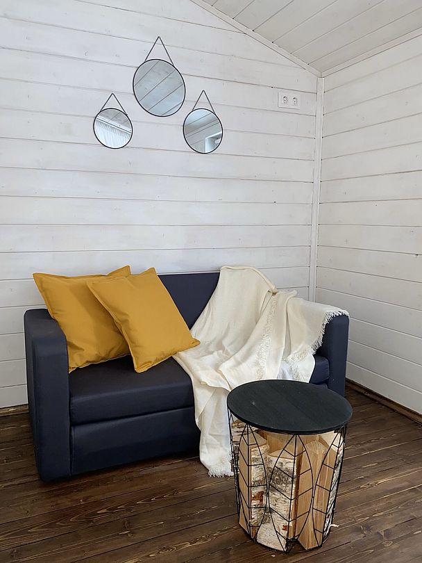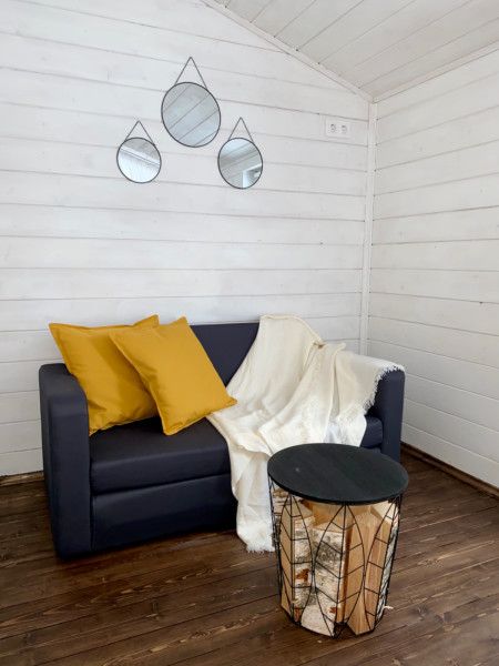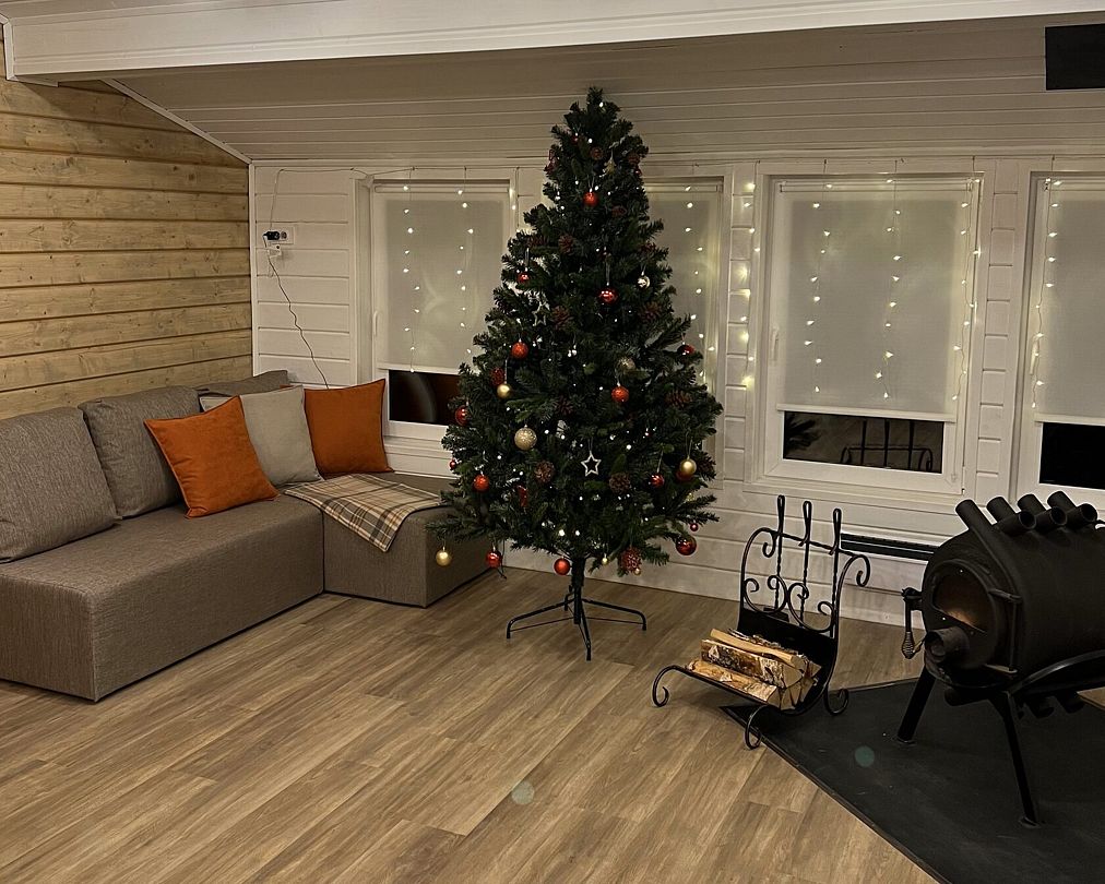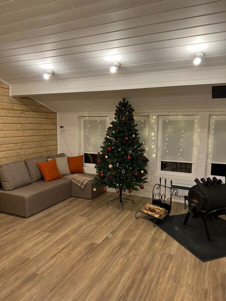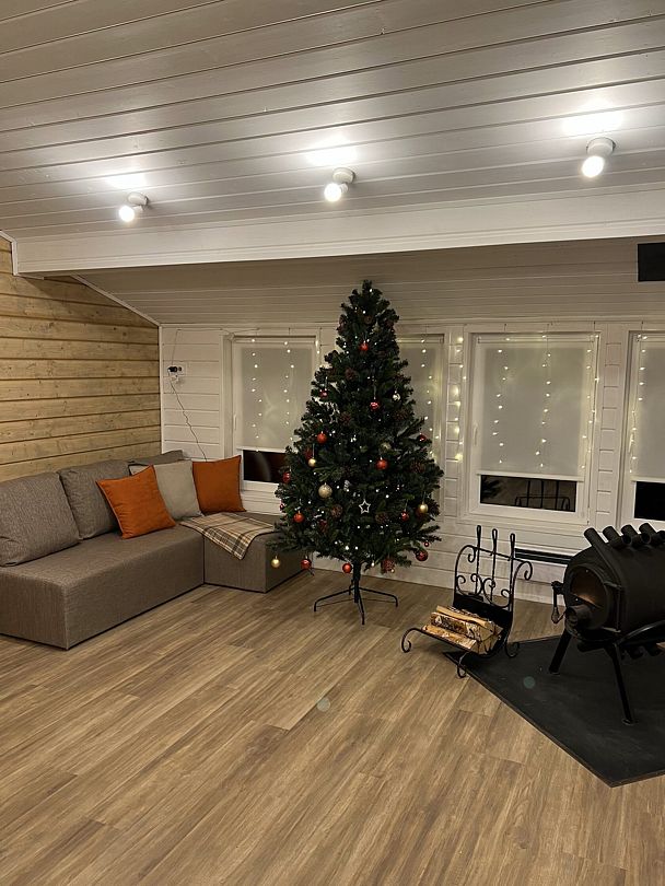 В доме с сауной-2 имеются две отдельные спальные комнаты с двухспальными кроватями и детской кроваткой. В гостиной есть два угловых раскладных дивана.