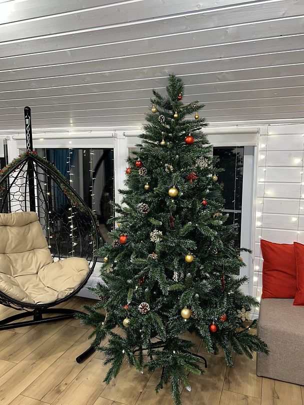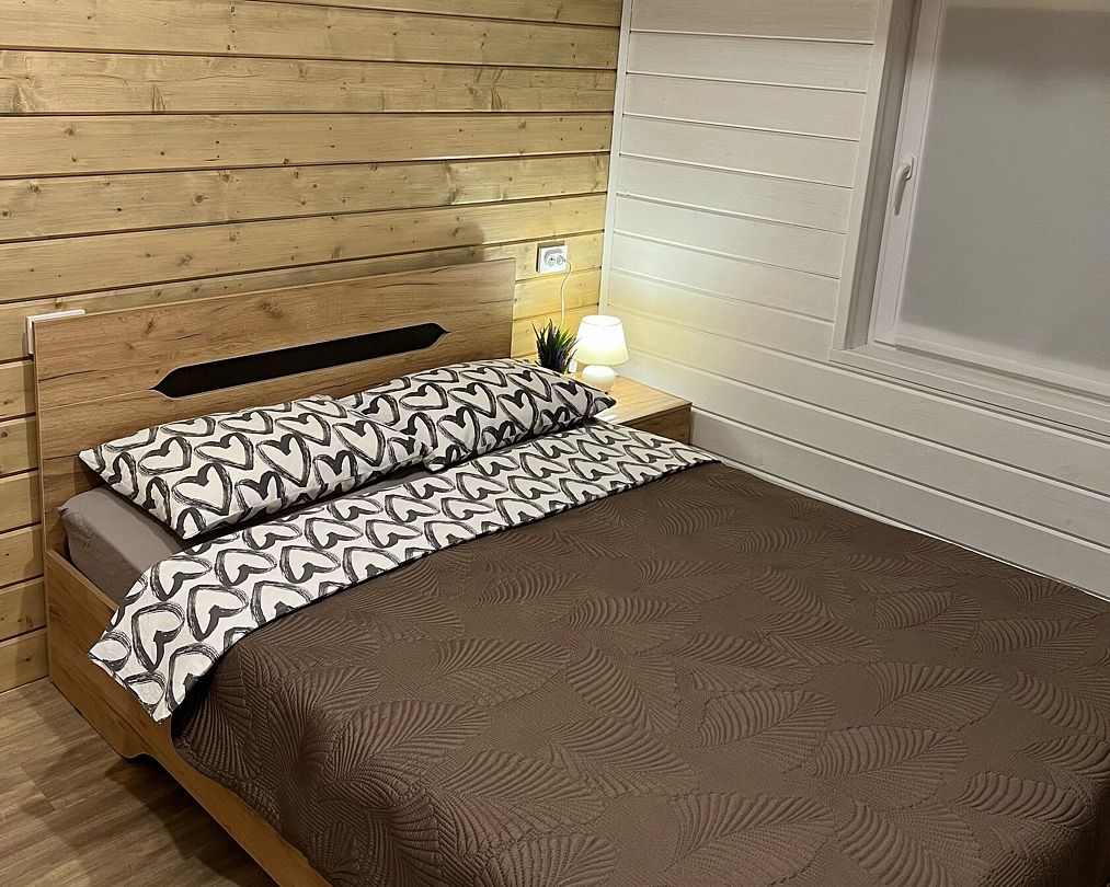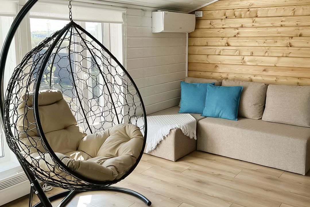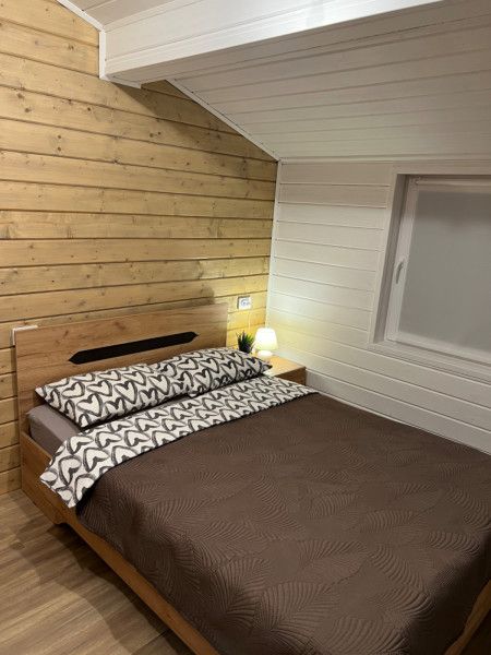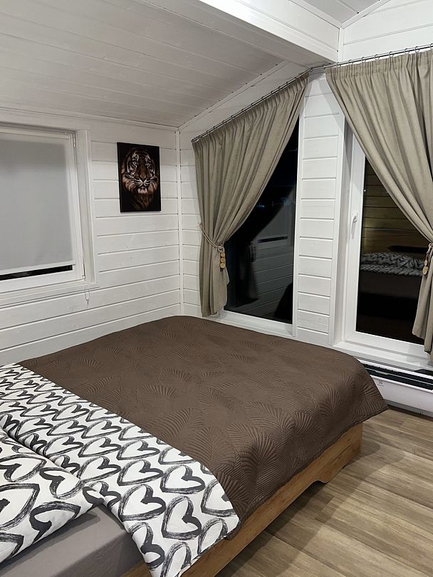 В доме с панорамными окнами имеются две отдельные спальные комнаты с двухспальными кроватями и детской кроваткой. В гостиной есть угловой раскладной диван.