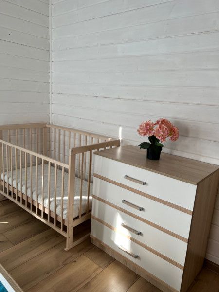 В доме с сауной-1 имеются две отдельные спальные комнаты с двухспальными кроватями и детской кроваткой. В гостиной есть два угловых раскладных дивана.