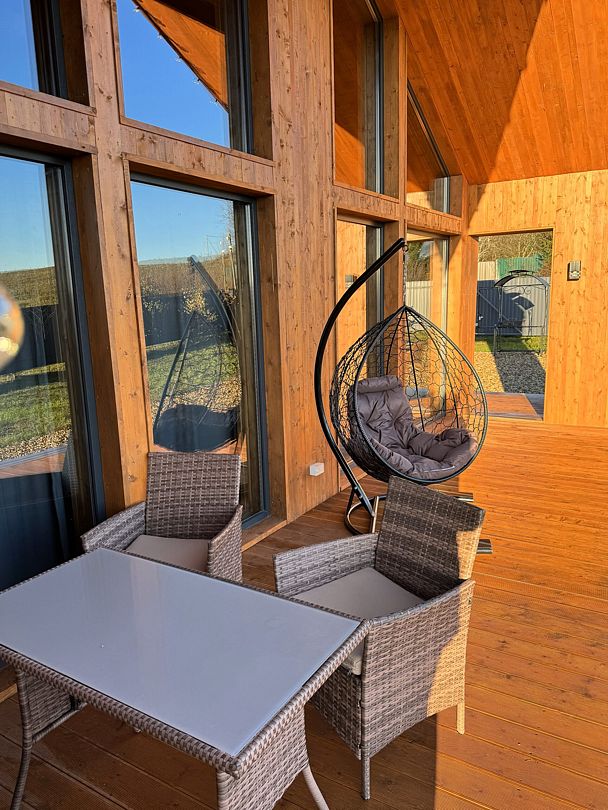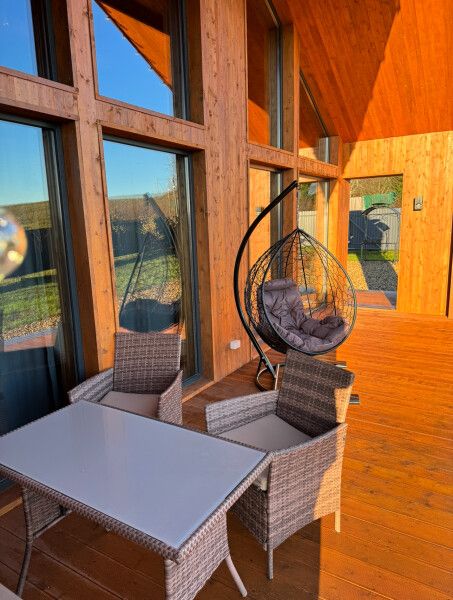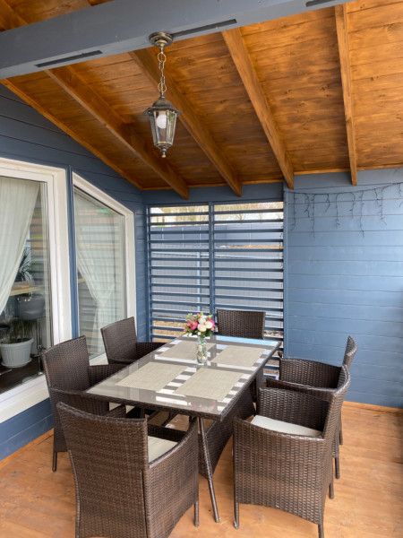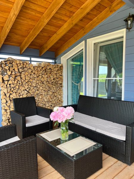 Благодаря антресоли сознание переключается. Появляется возможность остаться со всеми при этом в уединенном месте. Просторная веранда с садовой мебелью позволит спрятаться от дождя в пасмурный день.