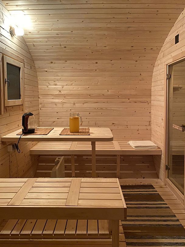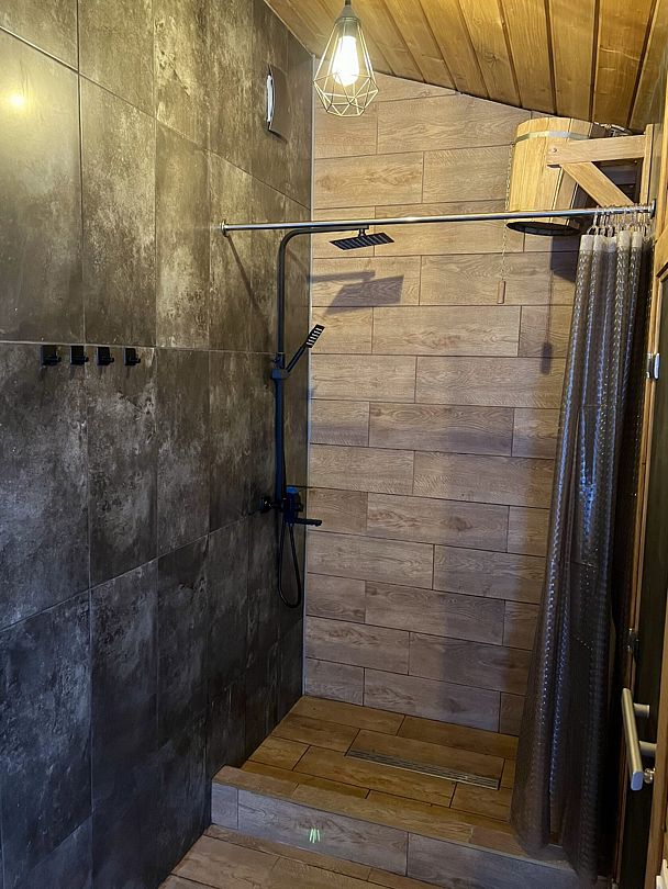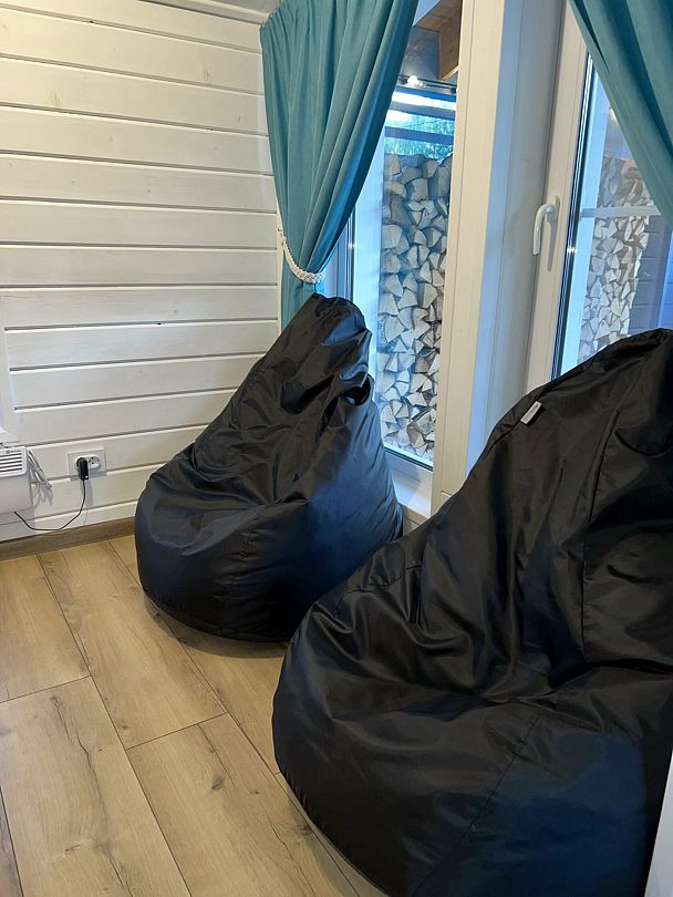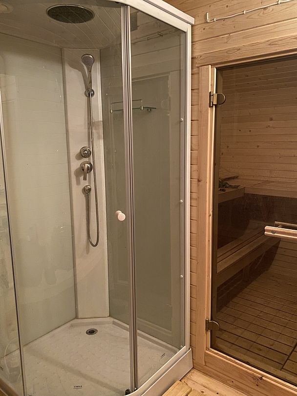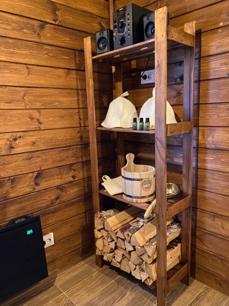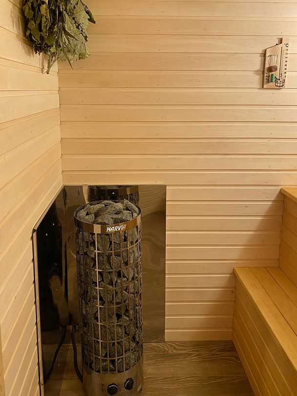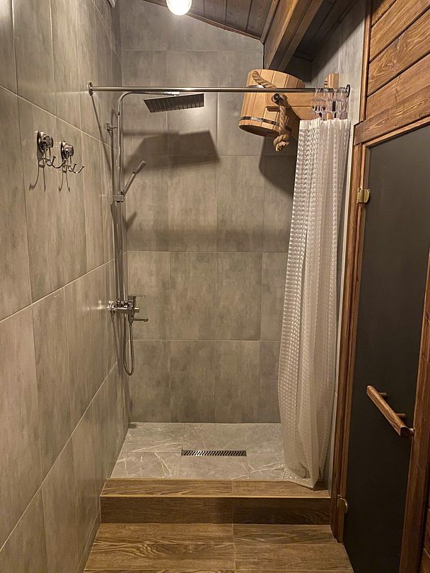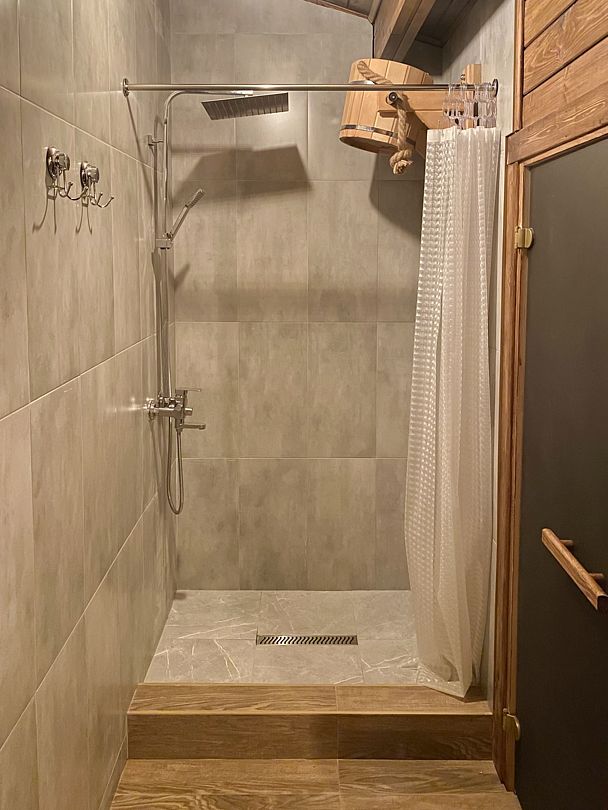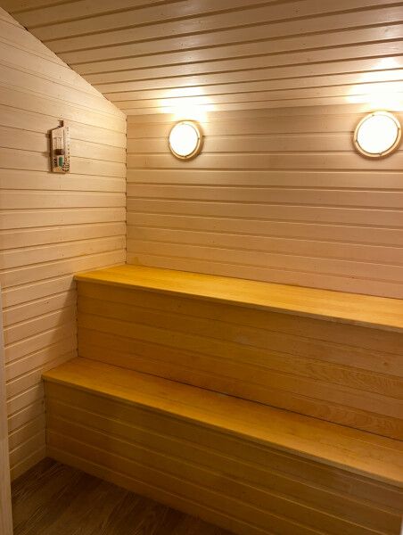 Сауна с комнатой отдыха и тропическим душем находится прямо внутри дома и оплачивается отдельно — 1500 ₽/час, минимум 2 часа.