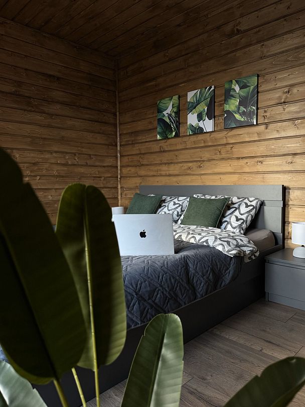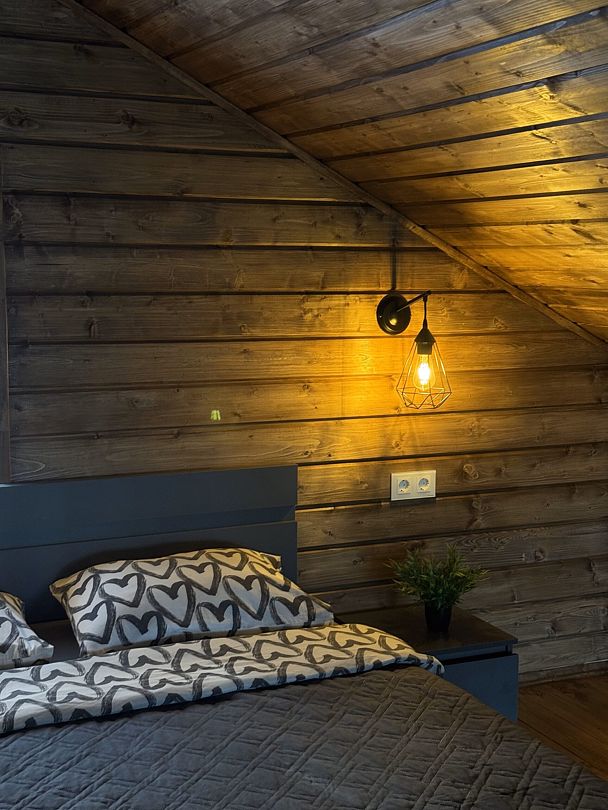 Отличительной особенностью этого дома являются темные, брутальные оттенки в интерьере, напоминающие берлогу. В доме имеется одна отдельная спальная комната с двухспальной кроватью и детской кроваткой. Антресоль с двухспальной кроватью. В гостиной есть угловой раскладной диван