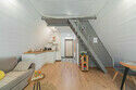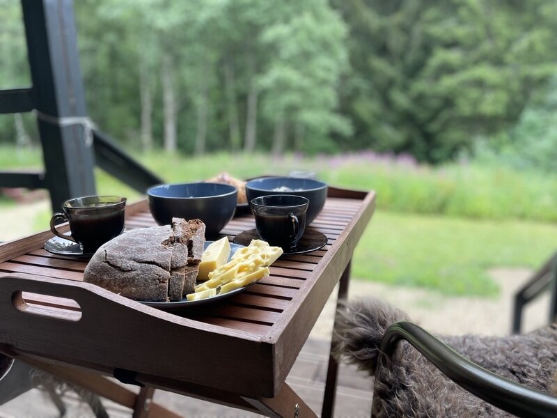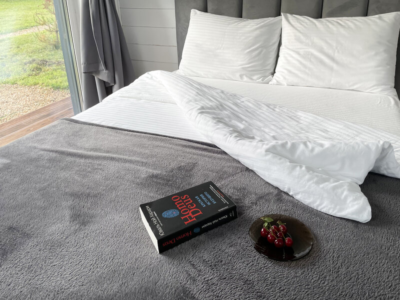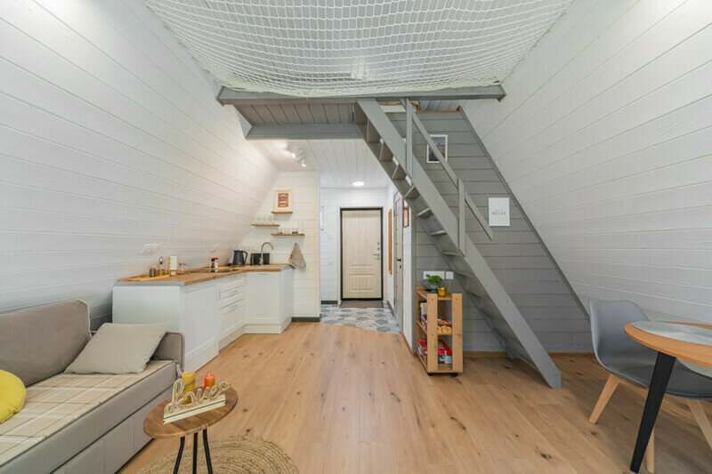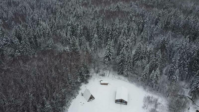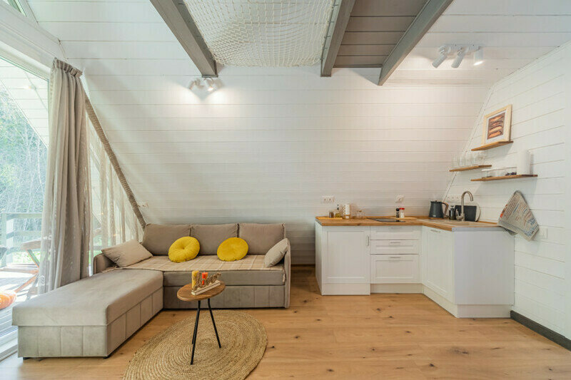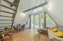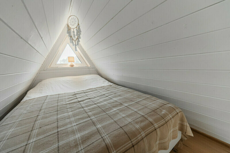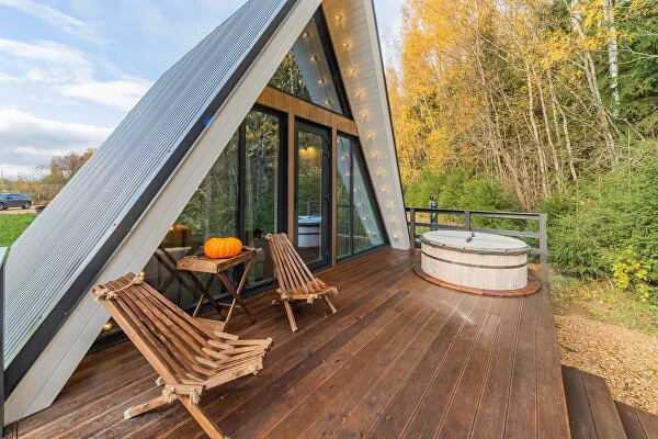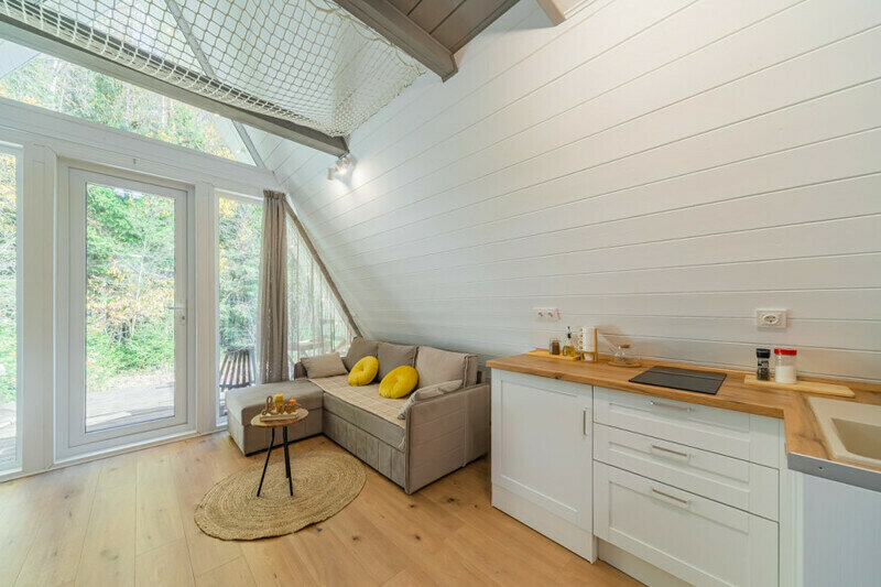 А-фрейм рассчитан на 4 человека. На втором этаже расположена двуспальная кровать. На первом этаже раскладной диван на двоих, обеденный стол со стульями, кухня, с/у с душем и терраса с видом на дикий лес с шезлонгами и горячей купелью (необходимо заказывать отдельно).