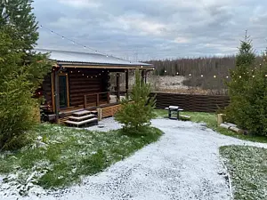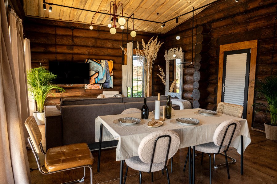 В наличии два коттеджа с дизайнерским интерьером и комфортной, теплой атмосферой. Вечером гости могут собраться у костра, чтобы насладиться спокойствием и общением с близкими.