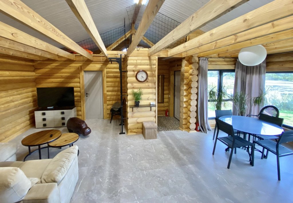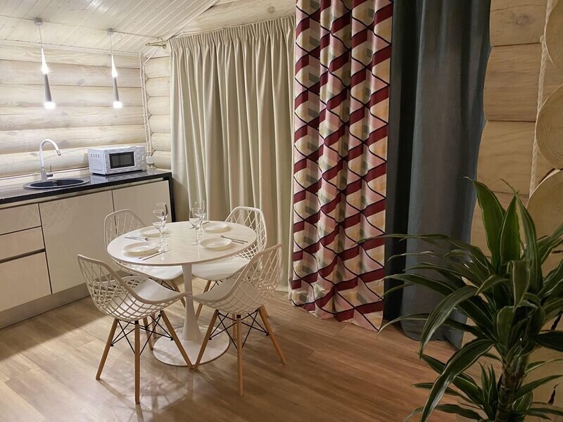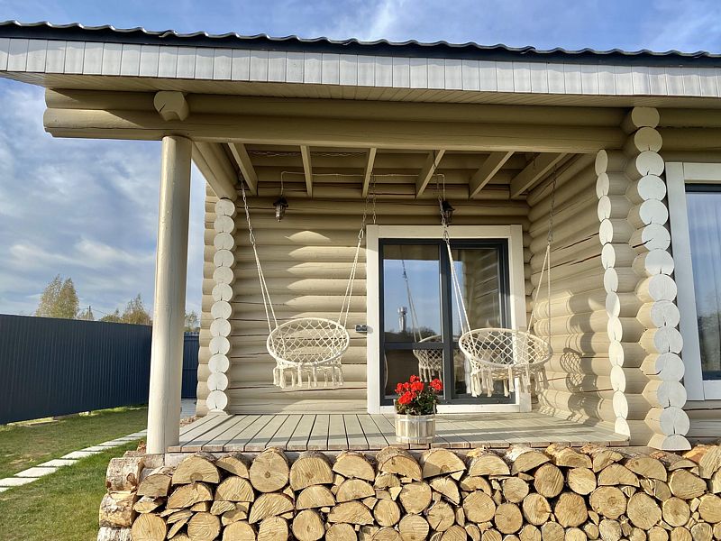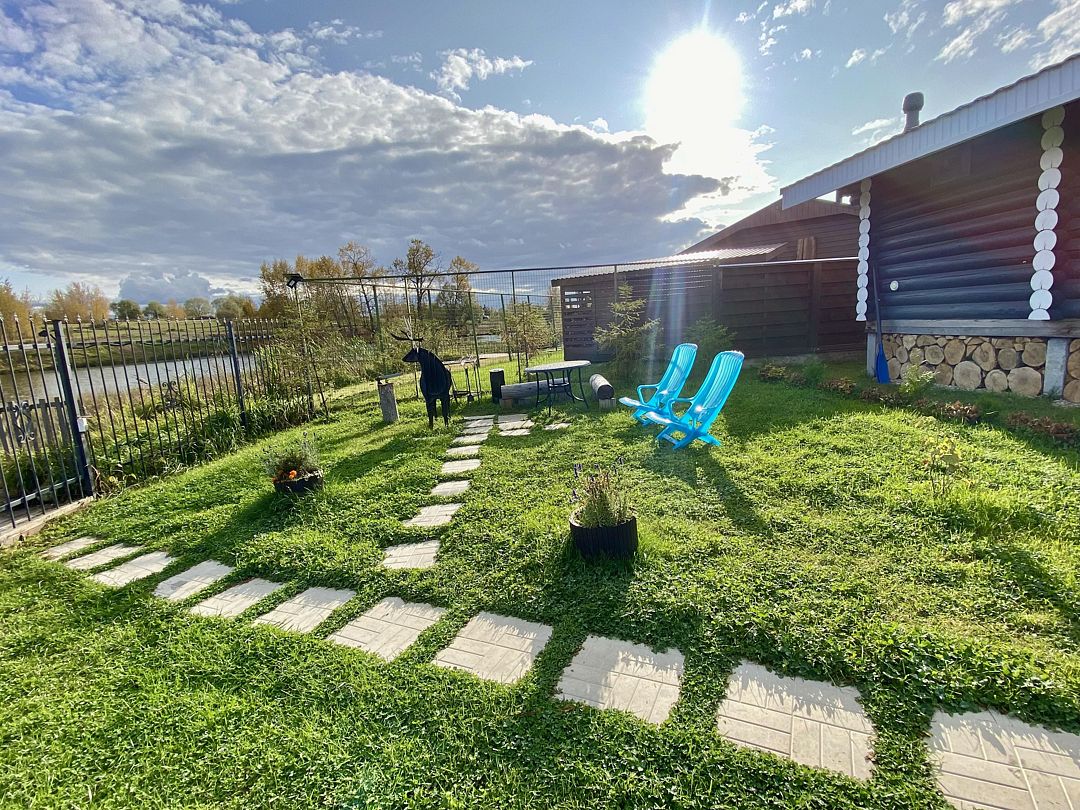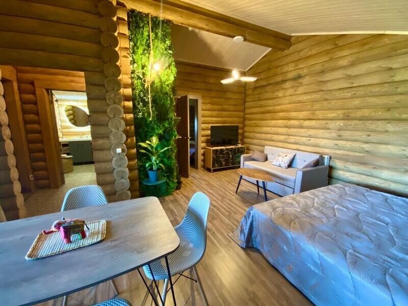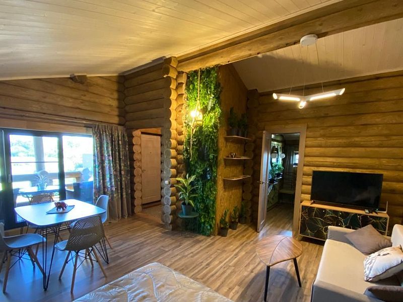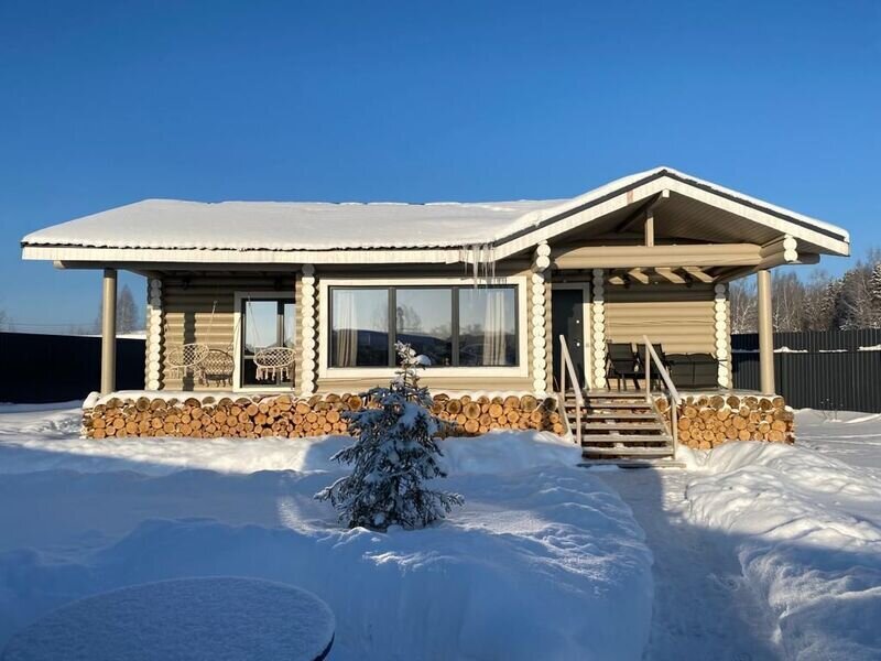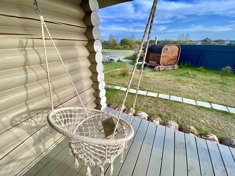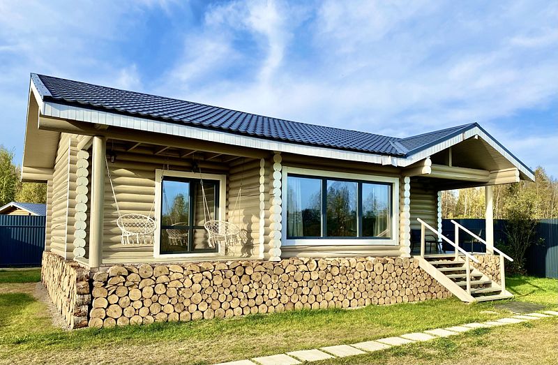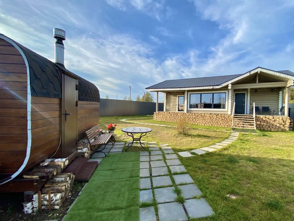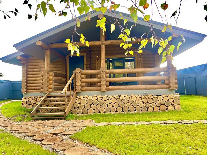 Домики из круглого бревна выполнены в русском стиле на берегу реки. У каждого дома своя территория с мангальной зоной, баней и банным чаном на дровах.
