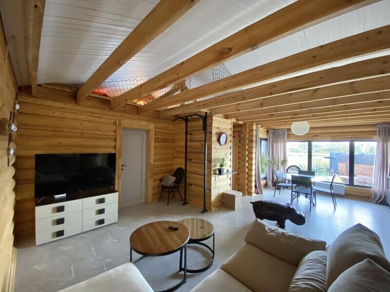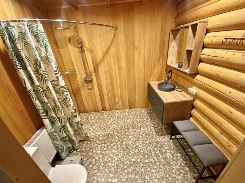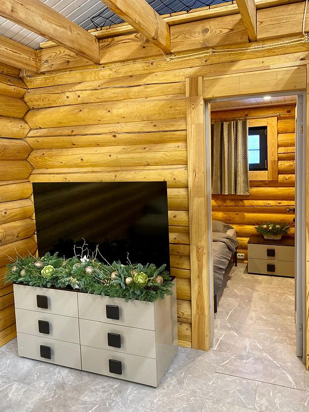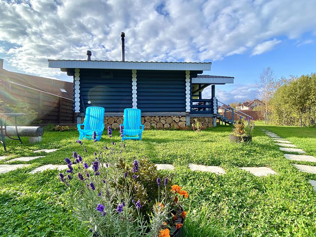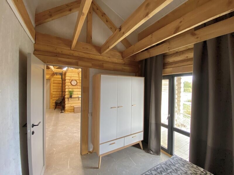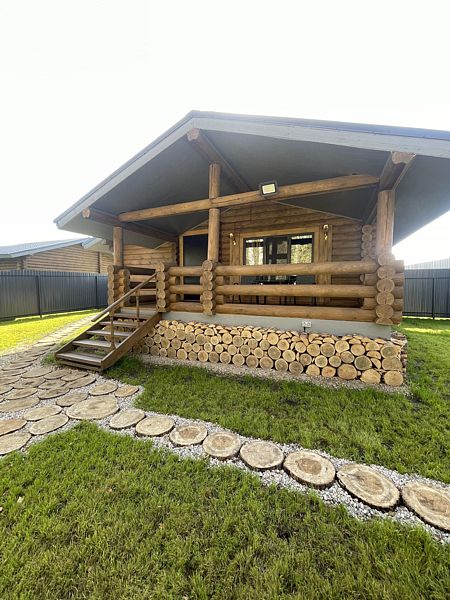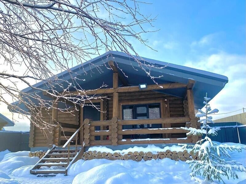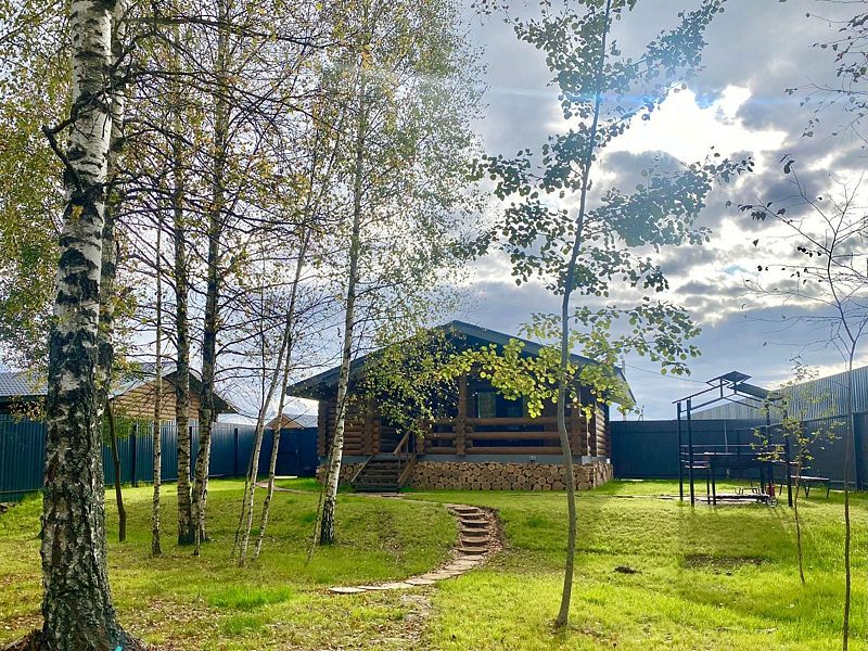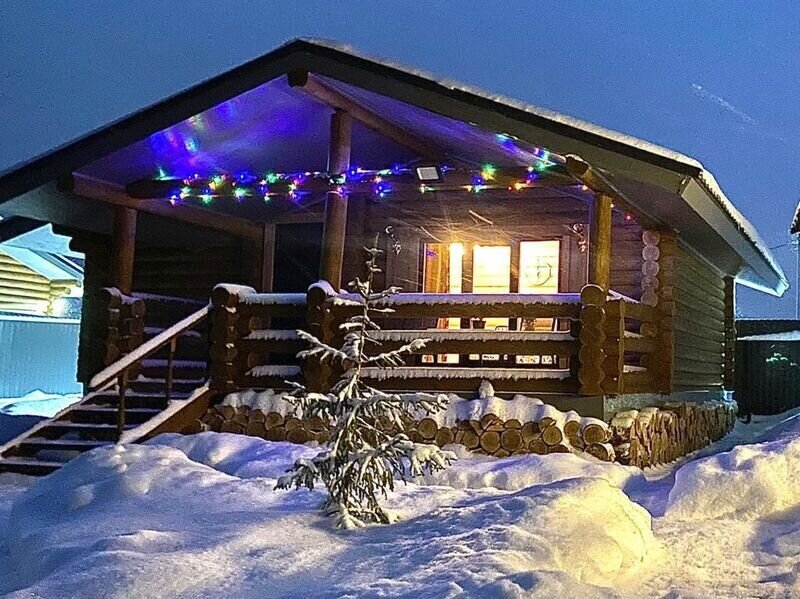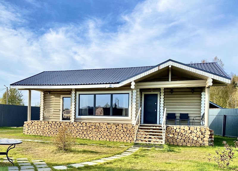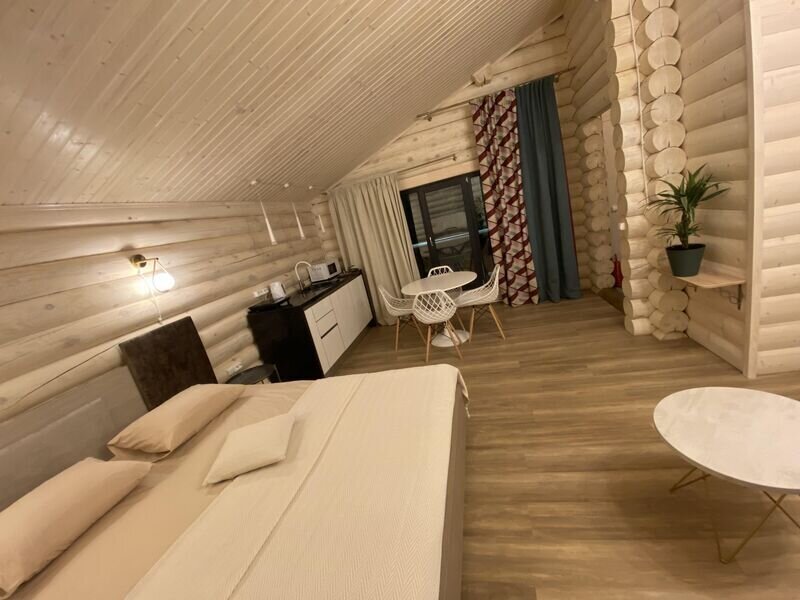 Домики из круглого бревна выполнены в русском стиле на берегу реки. У каждого дома своя территория с мангальной зоной, баней и банным чаном на дровах.