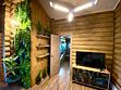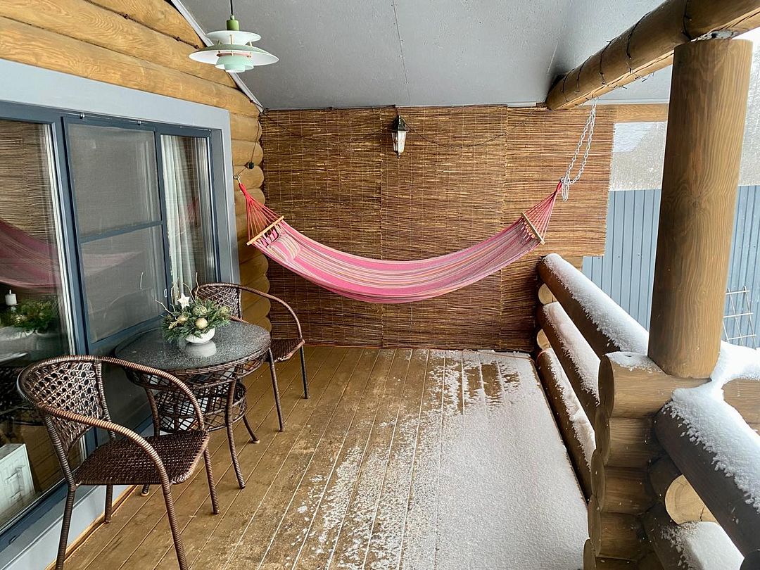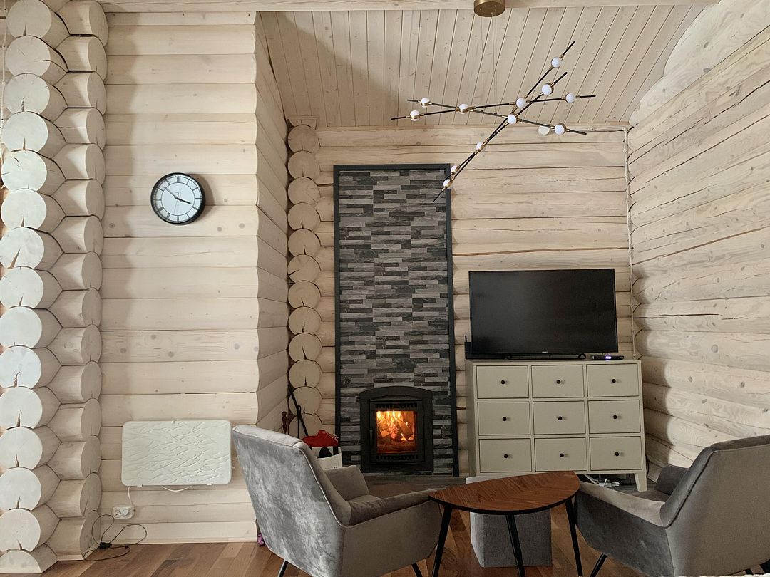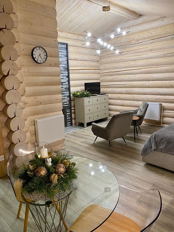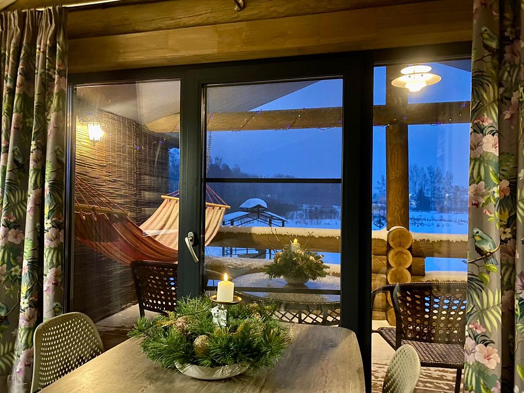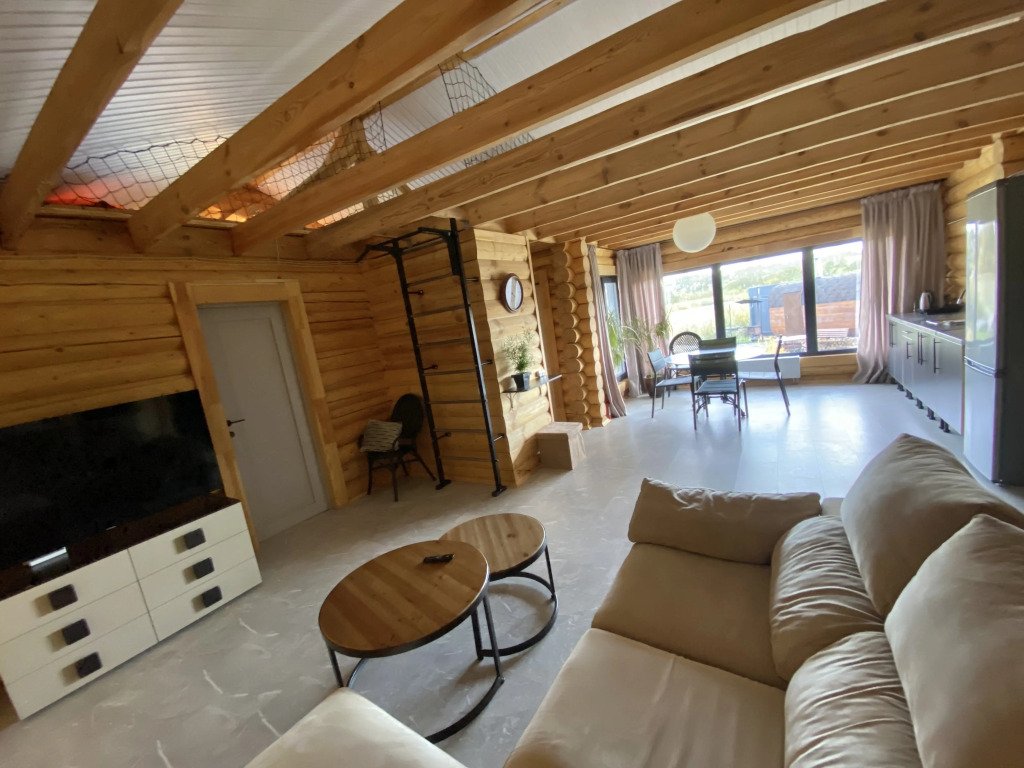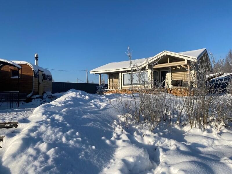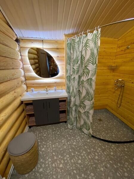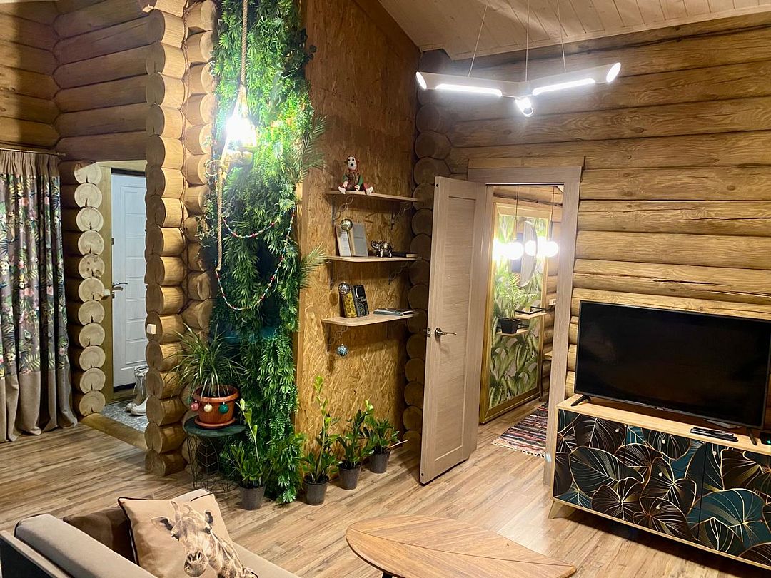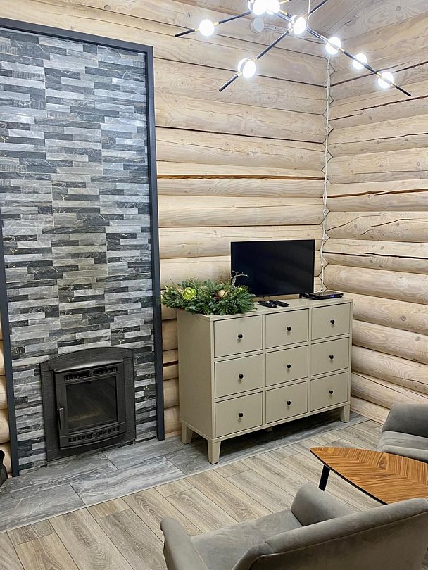 Домики из круглого бревна выполнены в русском стиле на берегу реки. У каждого дома своя территория с мангальной зоной, баней и банным чаном на дровах.