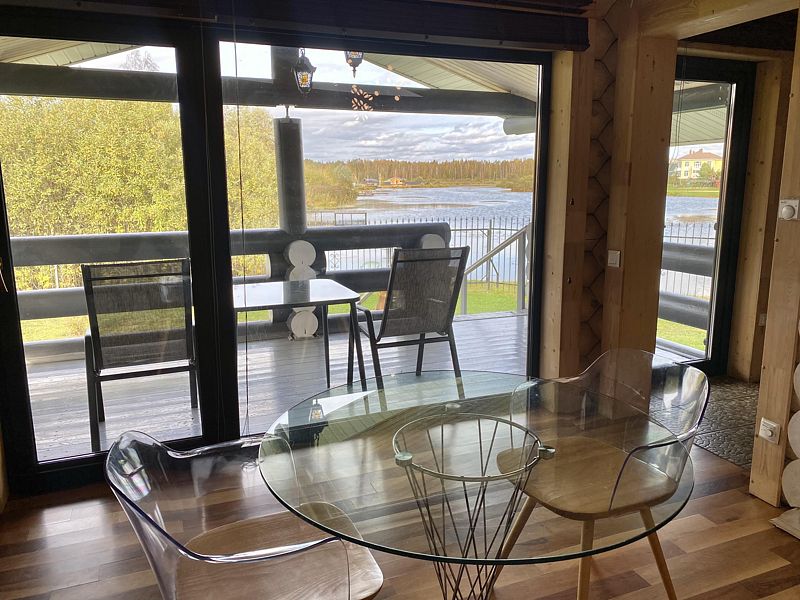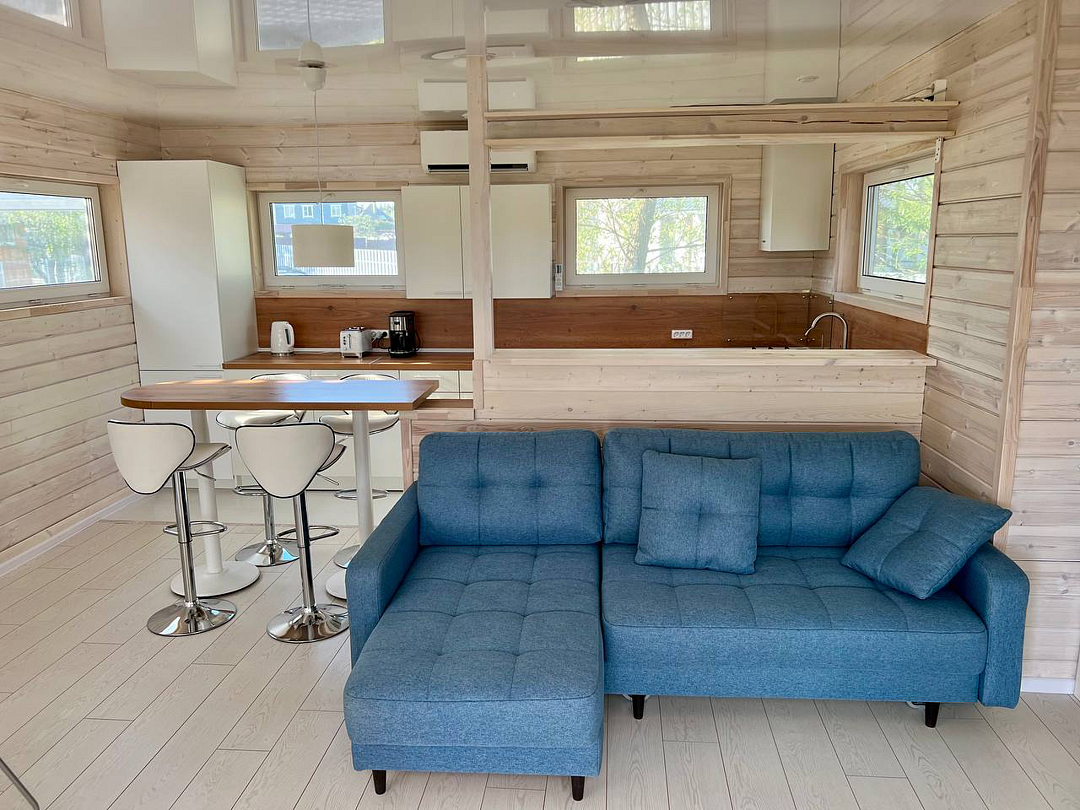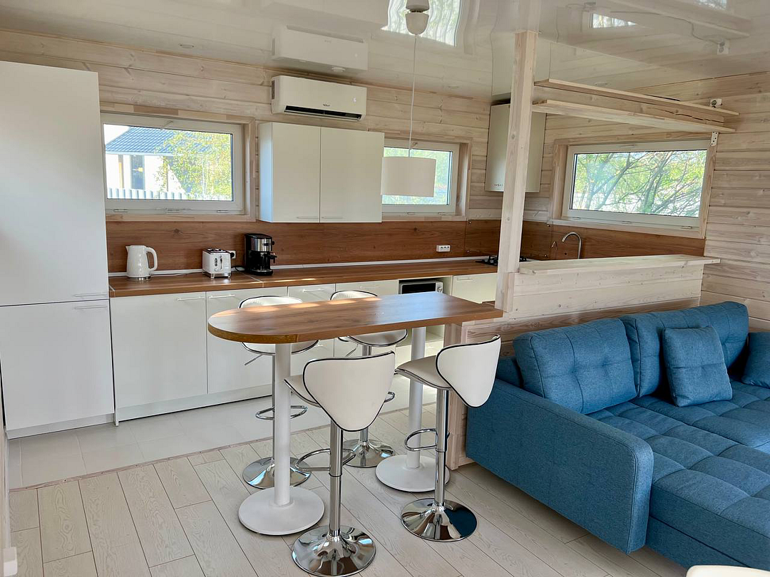 Внутри домика вы найдете все необходимое для комфортного проживания. Просторная гостиная с удобными мебелью создаст атмосферу уюта и тепла. На оборудованной кухне вы сможете приготовить свои любимые блюда и насладиться их вкусом в обеденной зоне с прекрасным видом на пруд.