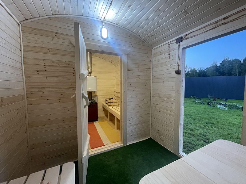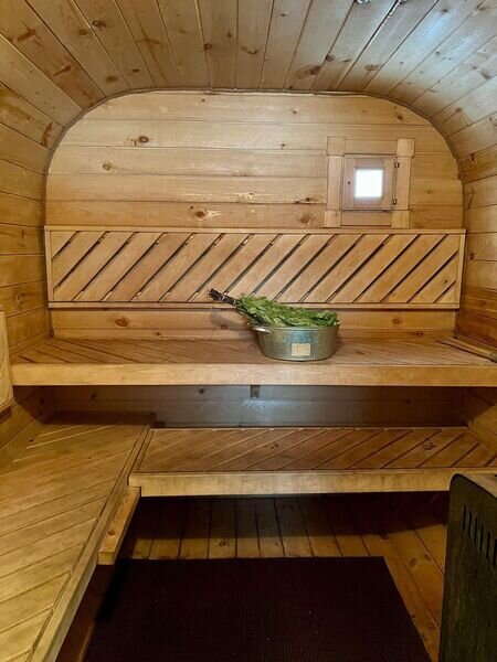 Баня бочка на дровах. Веники (береза , дуб, липа, разнотравье). После парной можно окунуться в речку (зимой делают прорубь).
