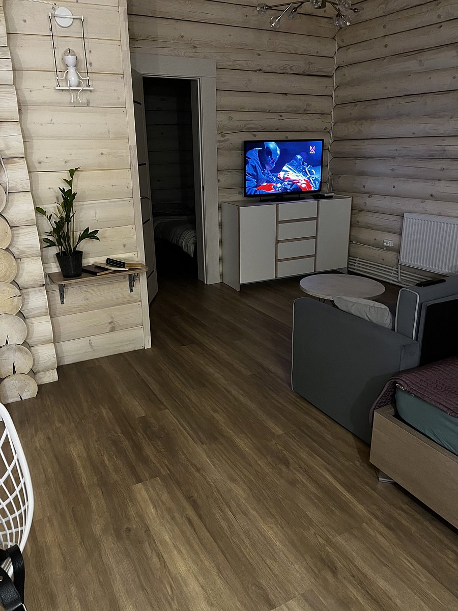 * Гостиная, также оснащена большой двуспальной кроватью , телевизором и симпатичным диванчиком.