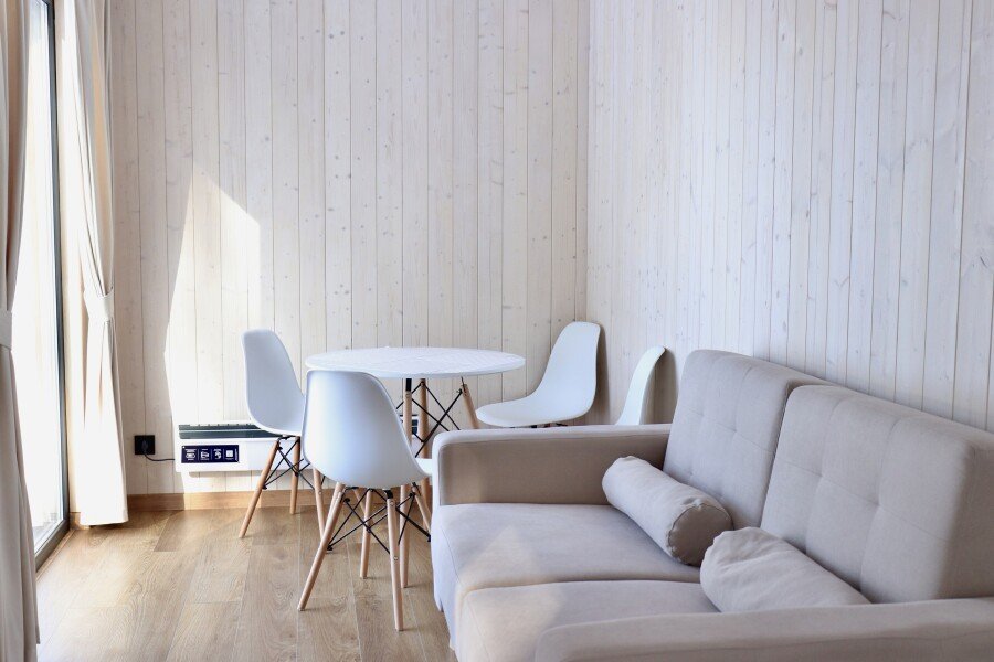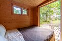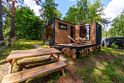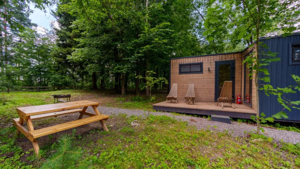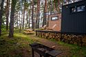 Домик среди сосен и берёз. Спальня, кухня и ванная комната. А самое главное — панорамные окна, чтобы просыпаясь, увидеть рассвет прямо из спальни и наблюдать малиновый закат из кухни-гостиной. Вечера лучше проводить на террасе с грилем и светящимися огоньками гирлянды. Рядом с домик есть доступ к ручью.