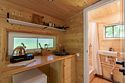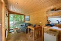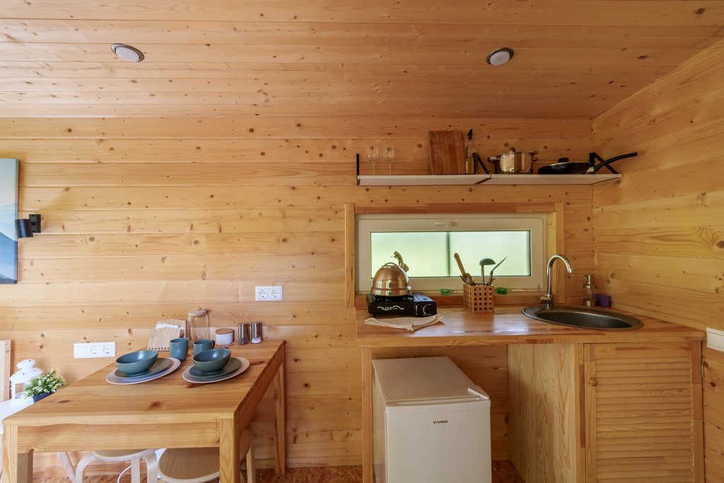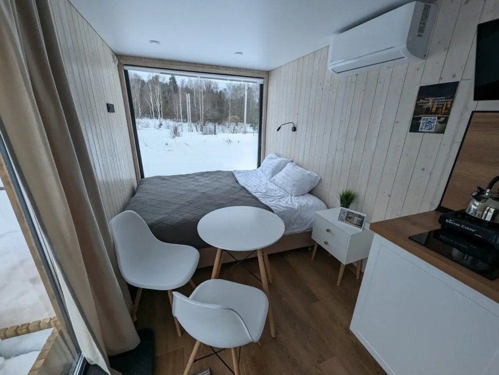 Небольшой уютный домик для двоих человек с собственным полностью укомплектованным санузлом, большой кроватью у панорамного окна, кухней и обеденной зоной.