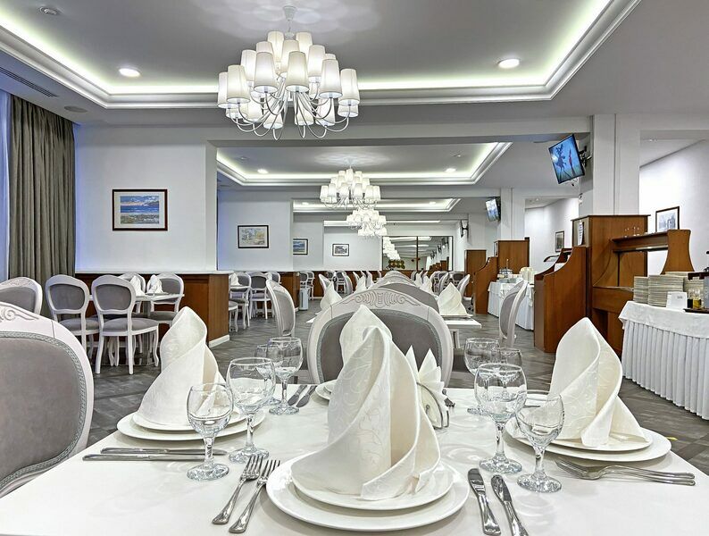 Зал ресторана способен единовременно накормить и обслужить до 250 человек.