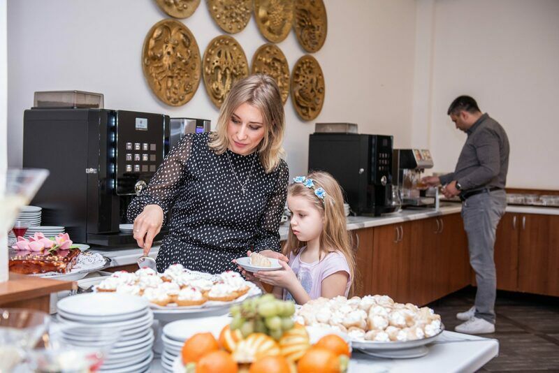 Режим работы: завтрак с 08:30 до 11:00, обед с 13:00 до 15:30, ужин с 18:00 до 20:30. Фуршетные столы с 11:30 до 13:00 и с 16:30 до 18:00.