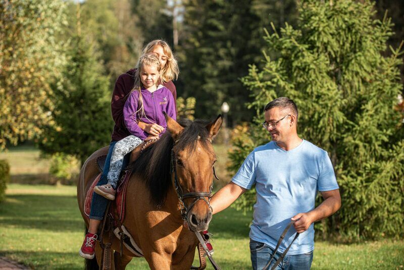 - катание верхом на лошади по территории отеля по кругу (вокруг спальных корпусов) — 400 ₽ / 5 минут (взрослые), 300 ₽ / 5 минут (дети до 12 лет);