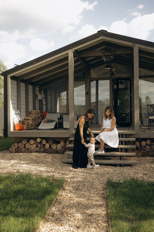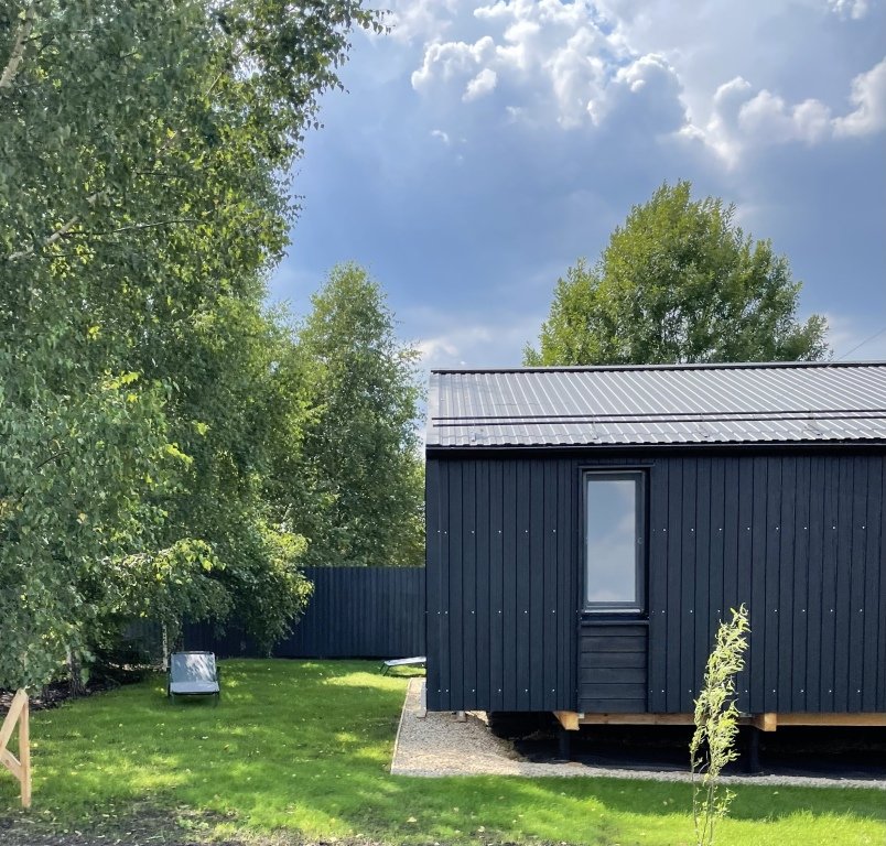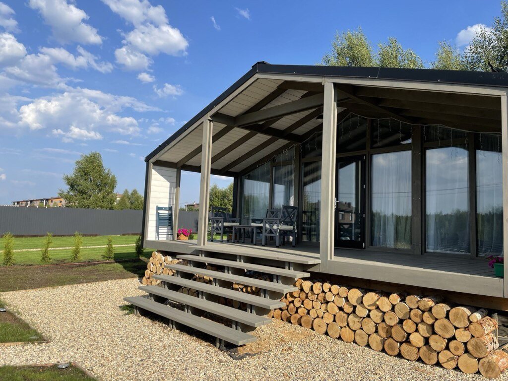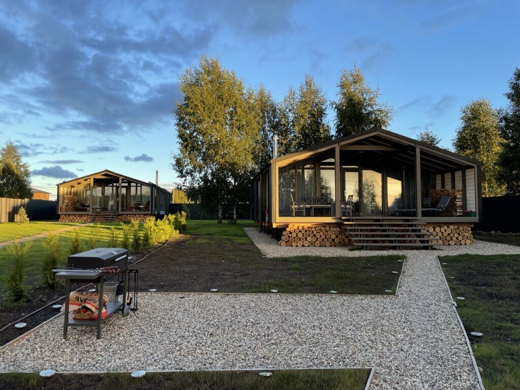 На участке 16 соток расположены 2 домика с территорией примерно 8 соток у каждого. В домиках есть просторная терраса с видом, панорамные окна с видом на закат и на реку, камин. На территории имеется парковка на 4 автомобиля.