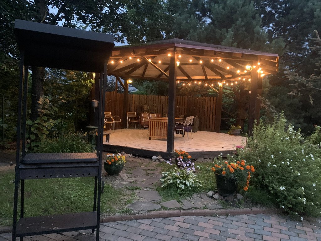 В распоряжении гостей есть площадка с очагом для костра, мангально-казанная зона — мангал, дровяная печь с казаном на 12 литров. Рядом расположена веранда-патио со столом на 10–12 человек. На территории также есть спортивная площадка с баскетбольным кольцом и площадка для малышей с качелями и песочницей. Для удобства гостей имеется парковка на 3 машины. Сауна в доме, во дворе имеется купель с холодной водой, которая в зимнее время доступна по предварительной договорённости. Для гостей без автотранспорта, по предварительной договорённости, может быть организован трансфер от станции «Нахабино».