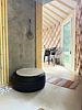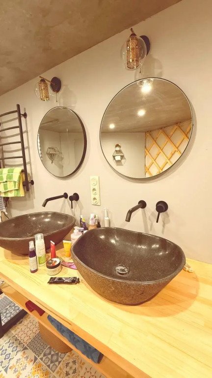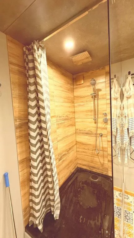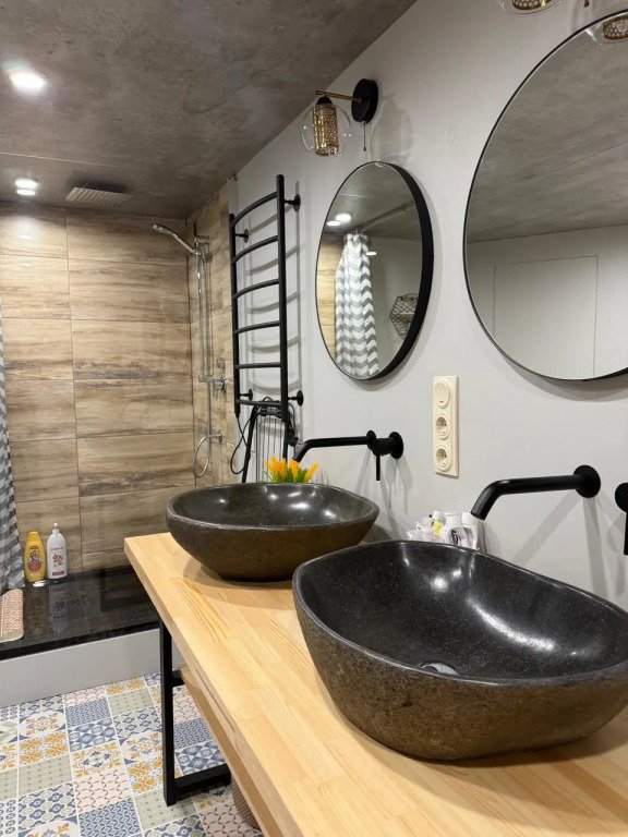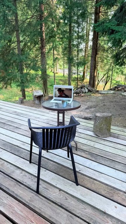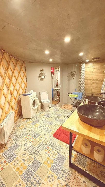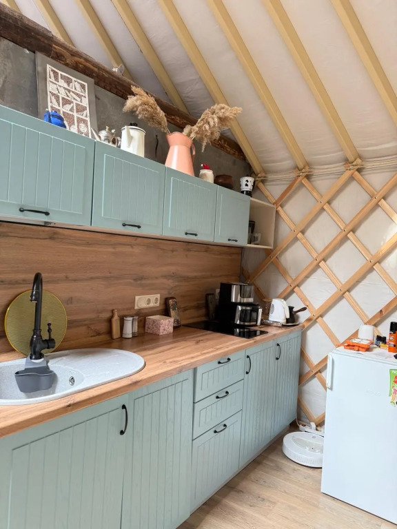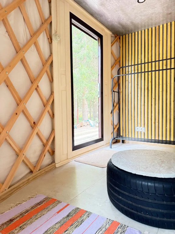 По участку протекают ручей и речка. Максимальное размещение — 4 гостя, предусмотрены три двуспальные спальные зоны, включая диван. Отопление, Wi-Fi, горячая вода. Внутри имеется санузел с душем, туалетом и стиральной машиной. Кухня оснащена чайником, посудой, базовым чайным набором. На всей площади установлен тёплый пол, который включается автономно при необходимости. Для гостей подготовлены постельное бельё, полотенца, набор гигиенических принадлежностей.