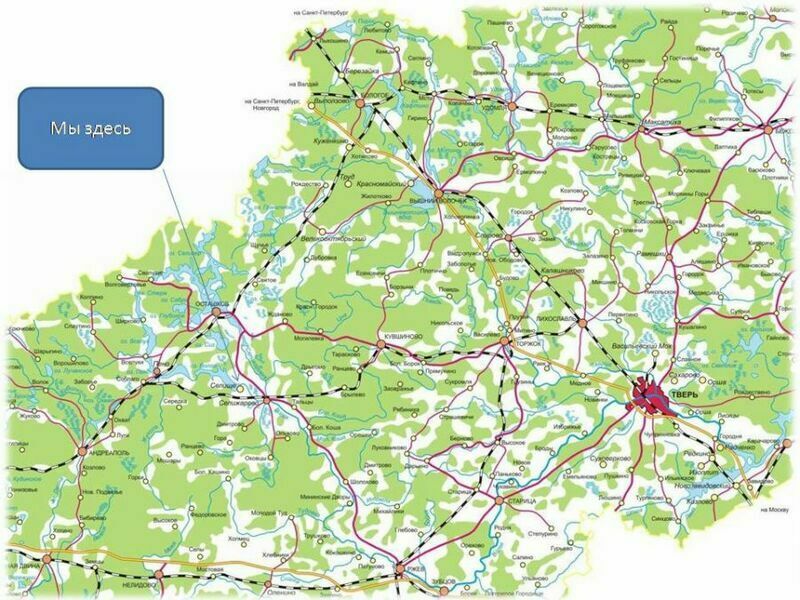 Далее едем по главной. Встречаем светофор перед ж/д мостом (зеленый горит поочередно). Проехав под мостом, едем дальше по главной и выезжаем из Ржева. Дорога Ржев-Селижарово-Осташков с хорошим покрытием и почти всегда пуста (ГАИ могут быть днем у переездов). Селижарово проезжаем по главной. Дальше едем примерно 15-20 км. до указателя Селище 5, здесь нужно повернуть налево. Это на 109 км. от Ржева.