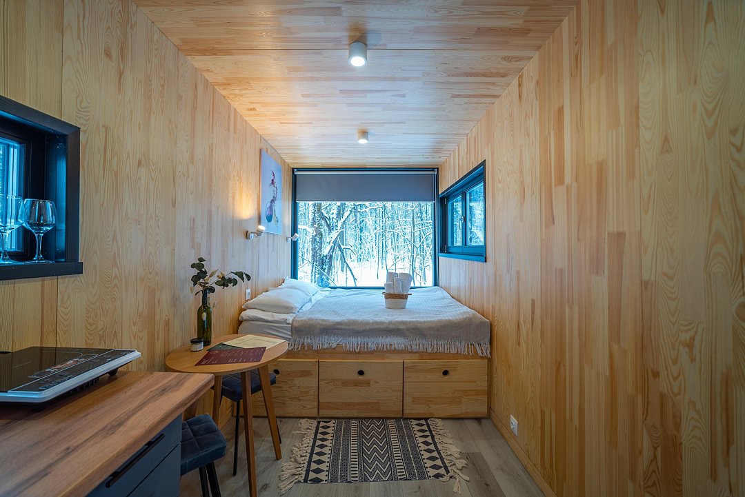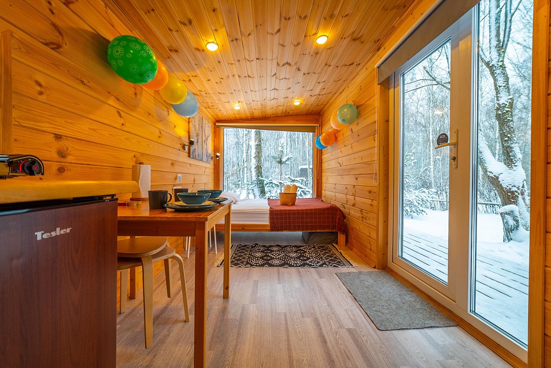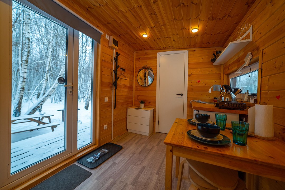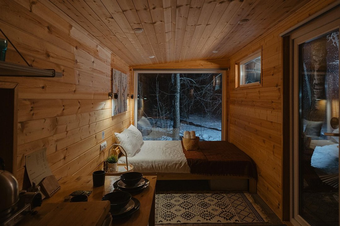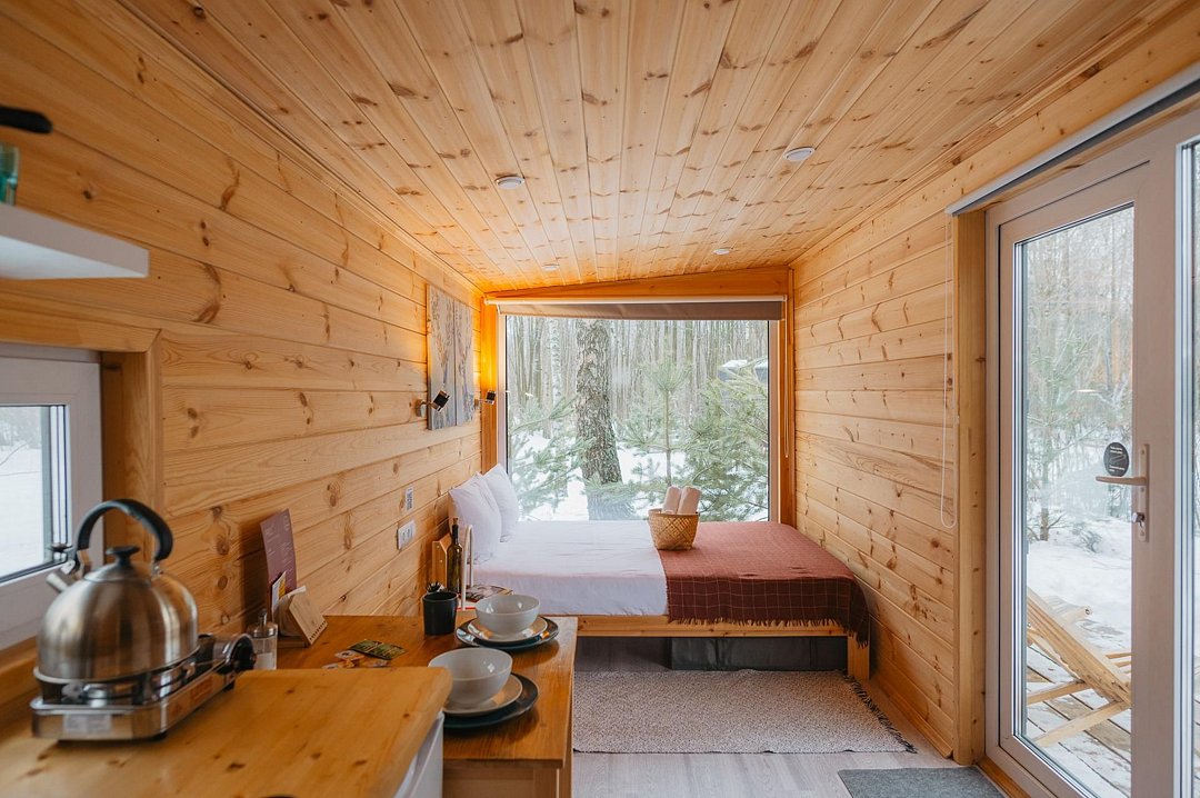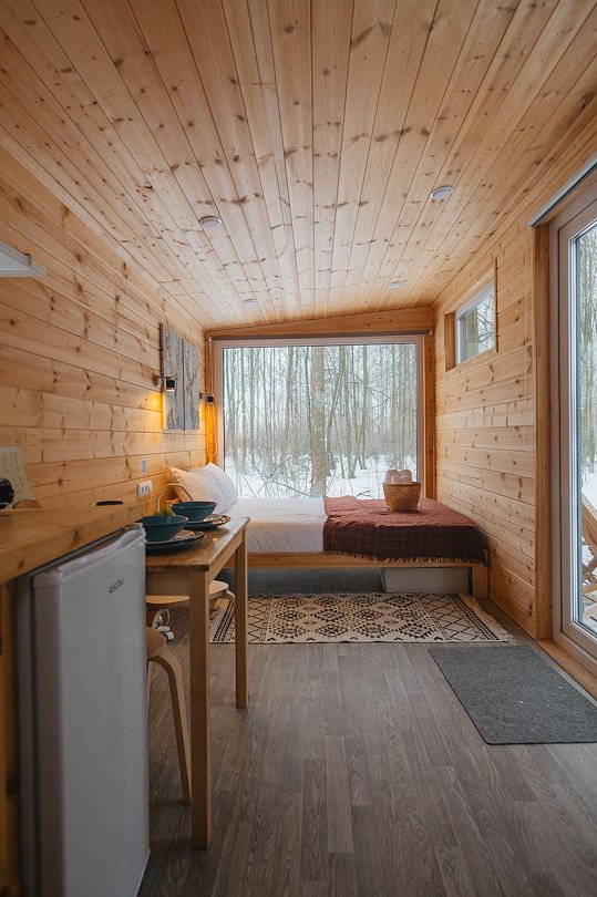 Внутри полноценная двуспальная кровать, камин, холодильник, обеденный стол со стульями и обогреватель, чтобы всегда было тепло.