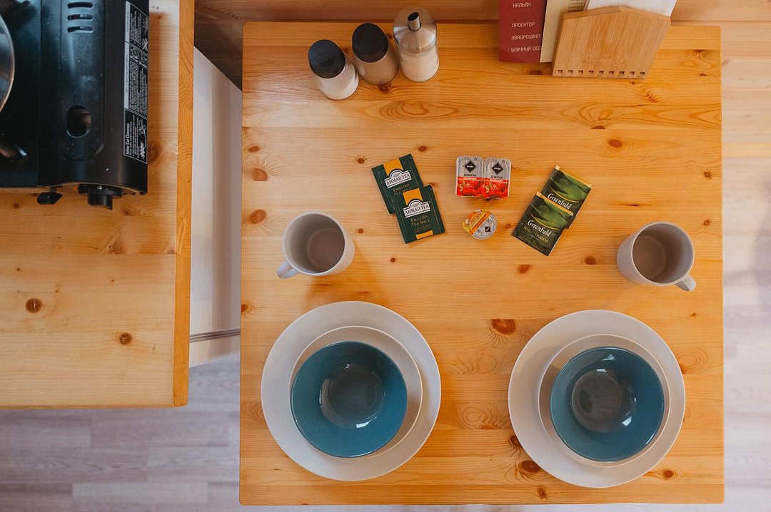 Яйца, хлеб, колбаса, сыр, бекон, помидоры и пару йогуртов будут ждать вас в холодильнике при заселении. Набор рассчитан на двух человек.
