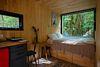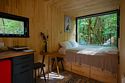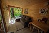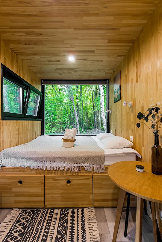 В доме с большим панорамным окном есть двуспальная кровать, кухня, холодильник и санузел с душем, есть терраса с мебелью и все принадлежности для барбекю.