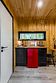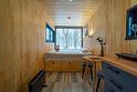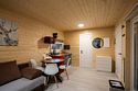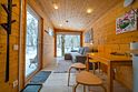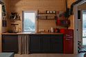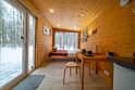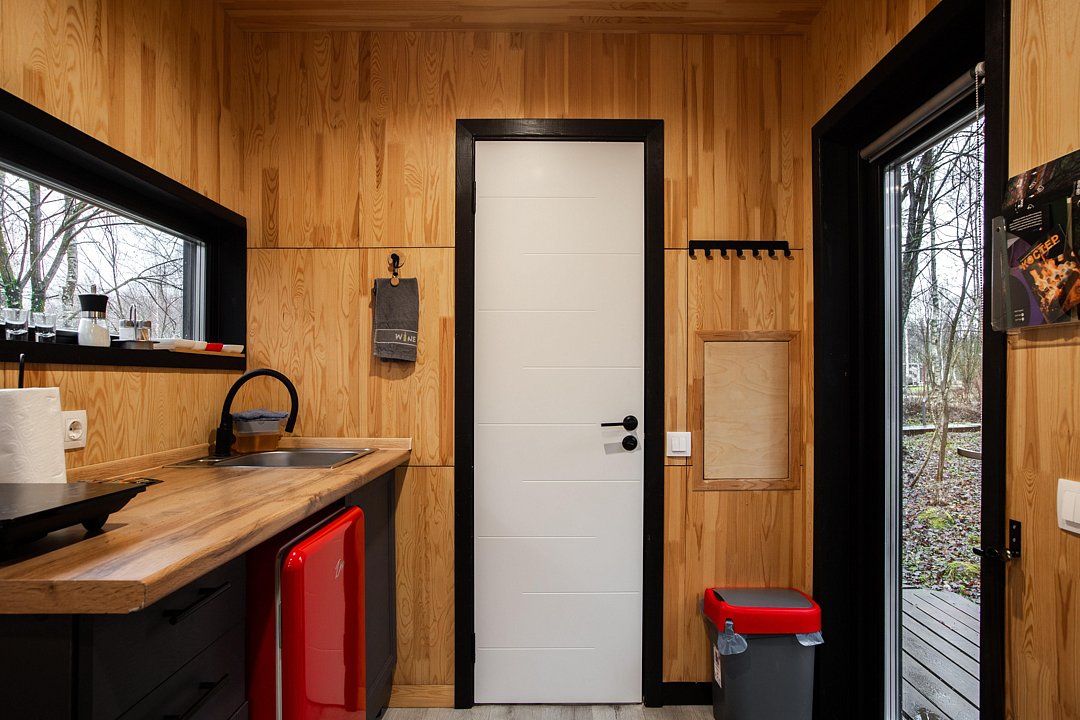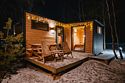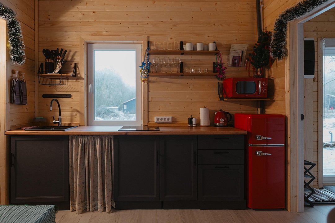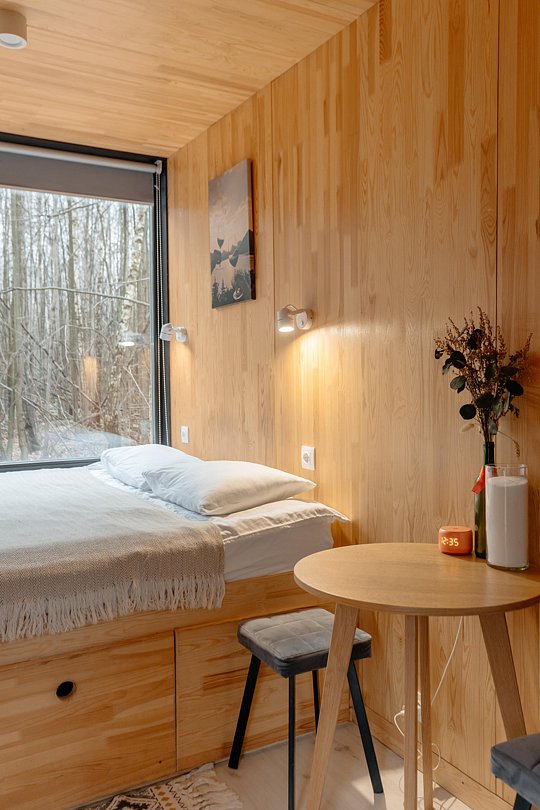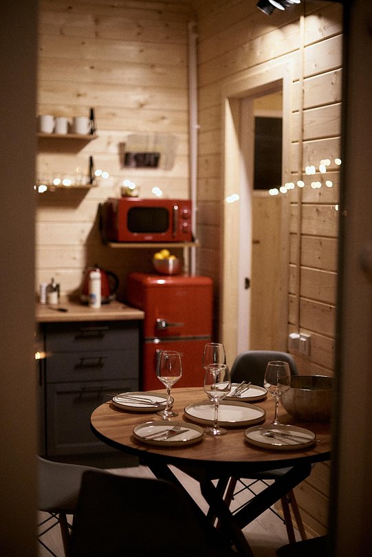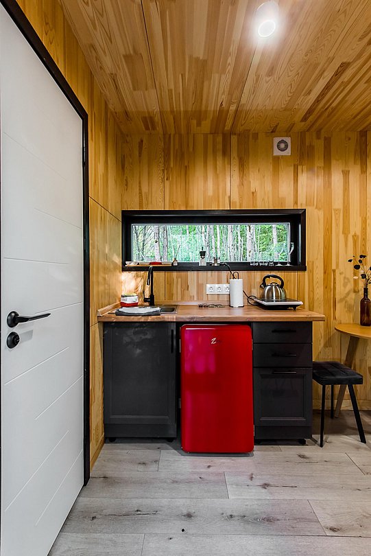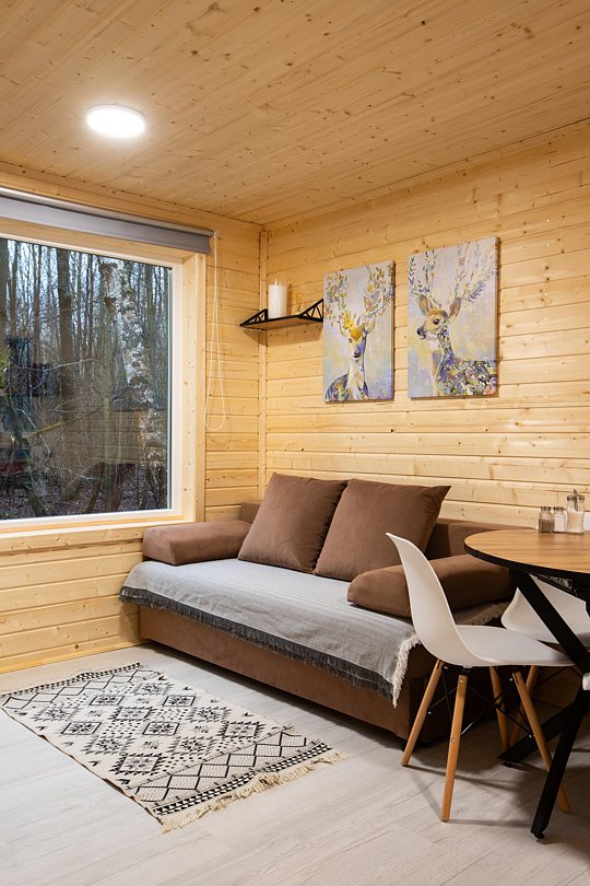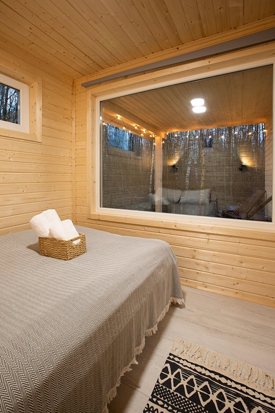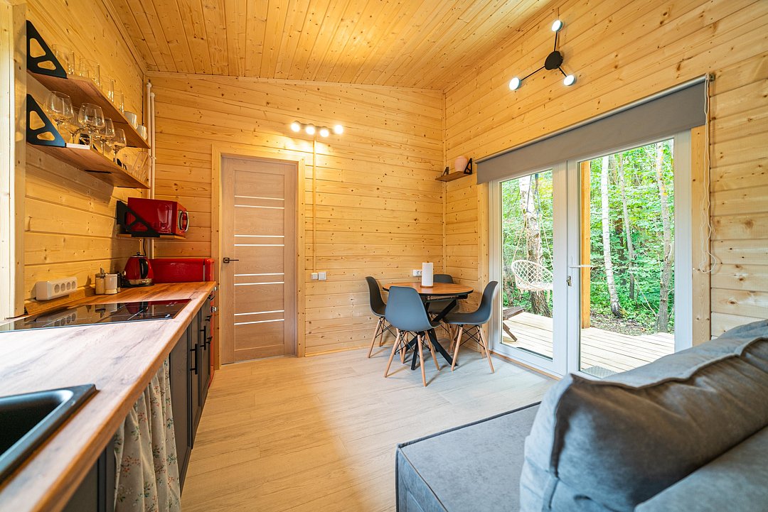 В доме на 6-х человек с большим панорамными окнами есть 2 спальни, а также кухня-гостиная с раскладывающимся диваном. В домике есть оборудованная кухня с холодильником и микроволновкой, санузел с душем, терраса с мебелью и мангальной зоной.