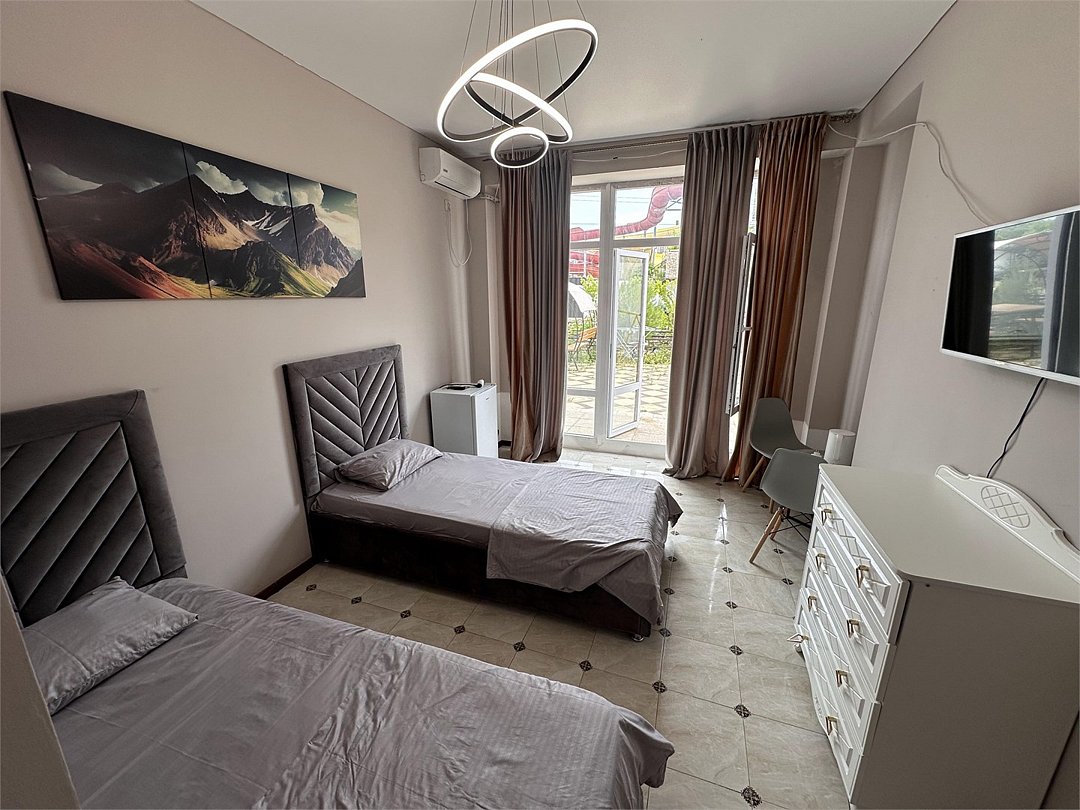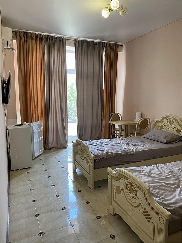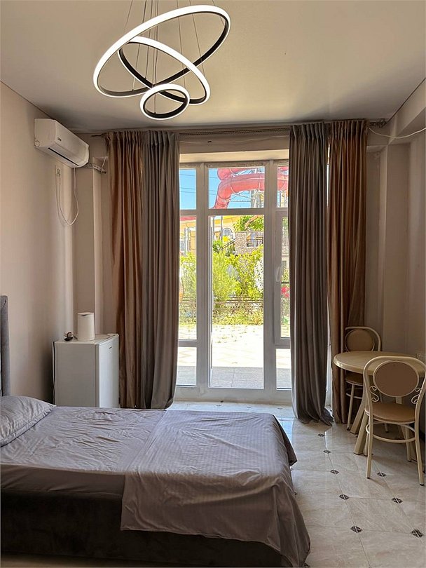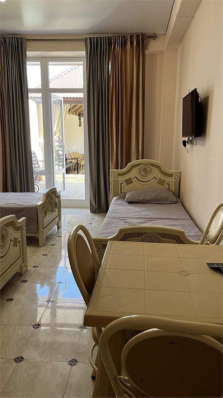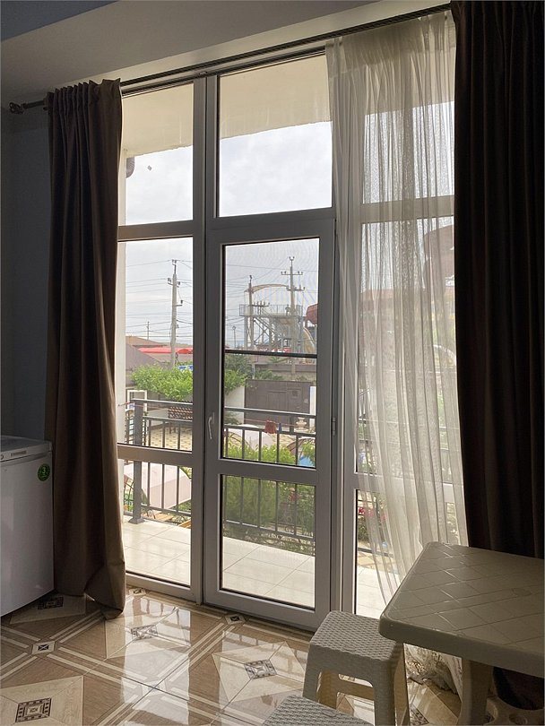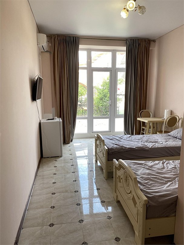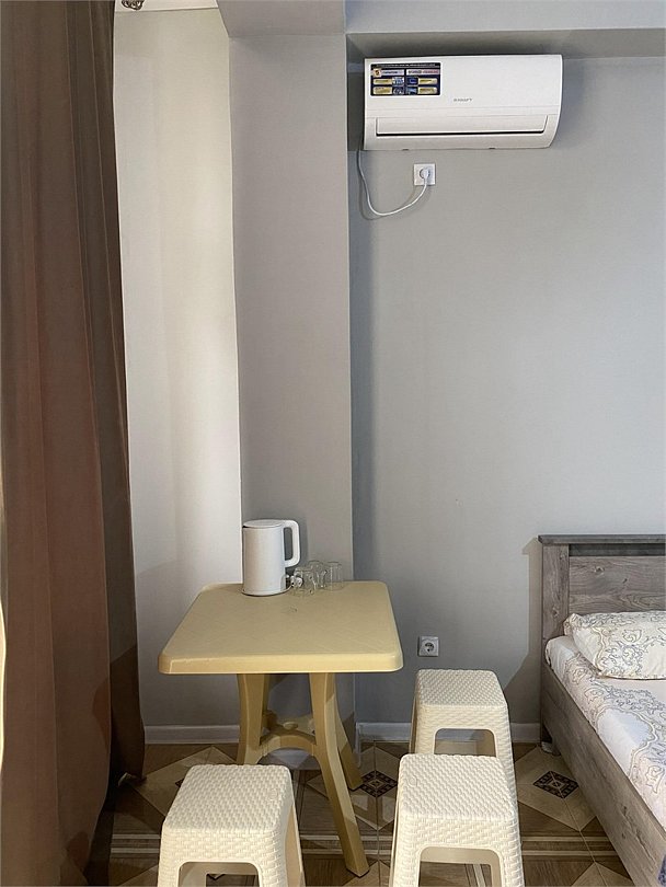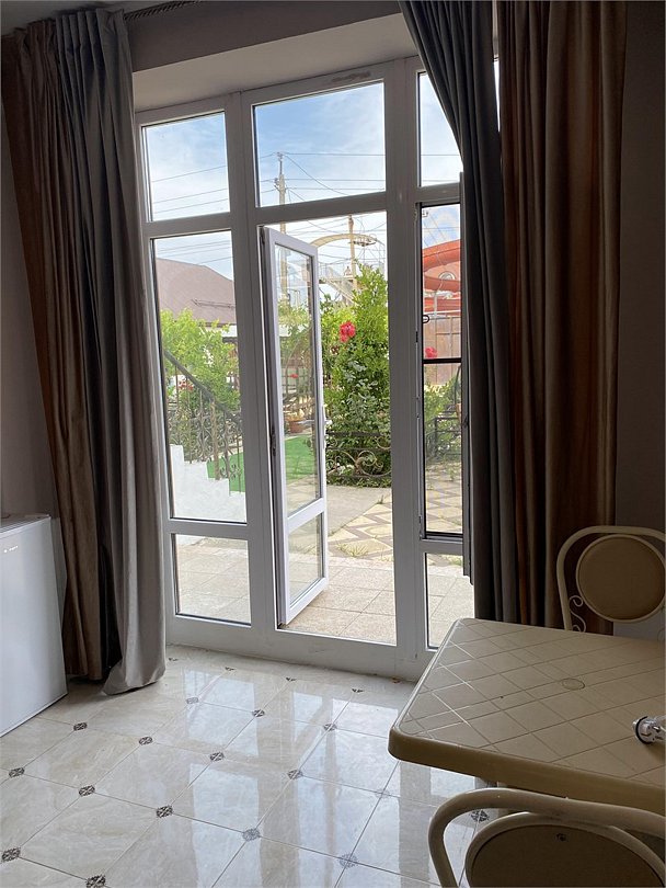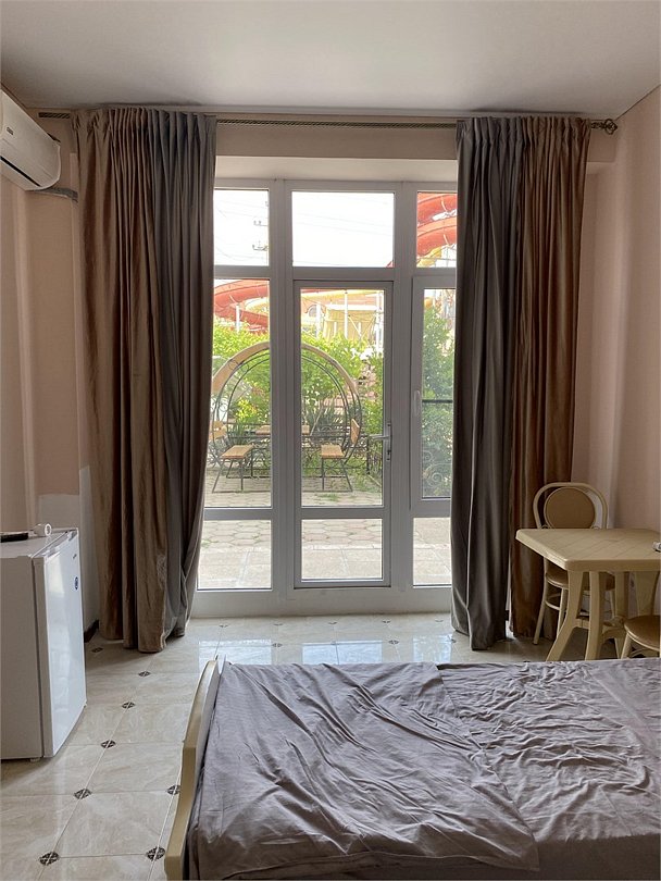 отдельный вход в номер со двора,вид во двор панорамные окна ,все условия в номере душ ,санузел, сплит система ,мини холодильник , телевизор, электро чайник и стол!Услуги и удобства