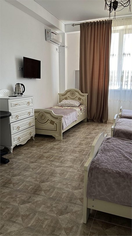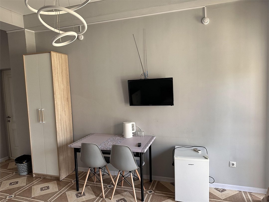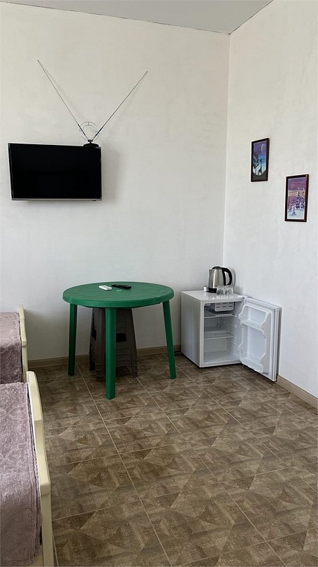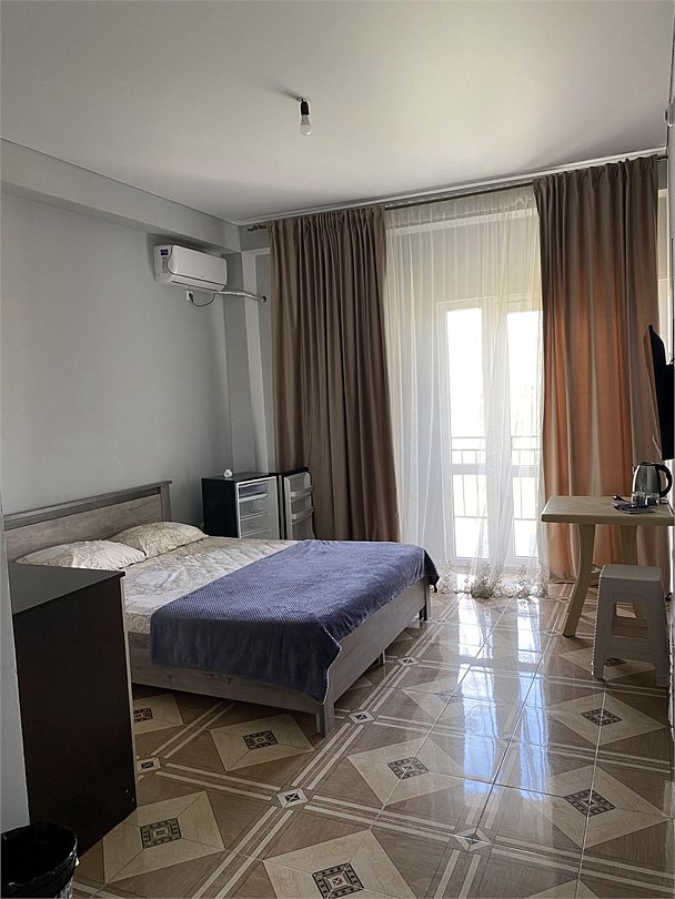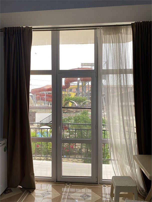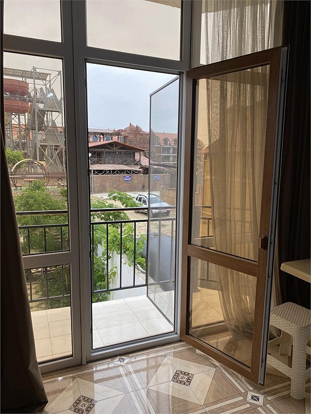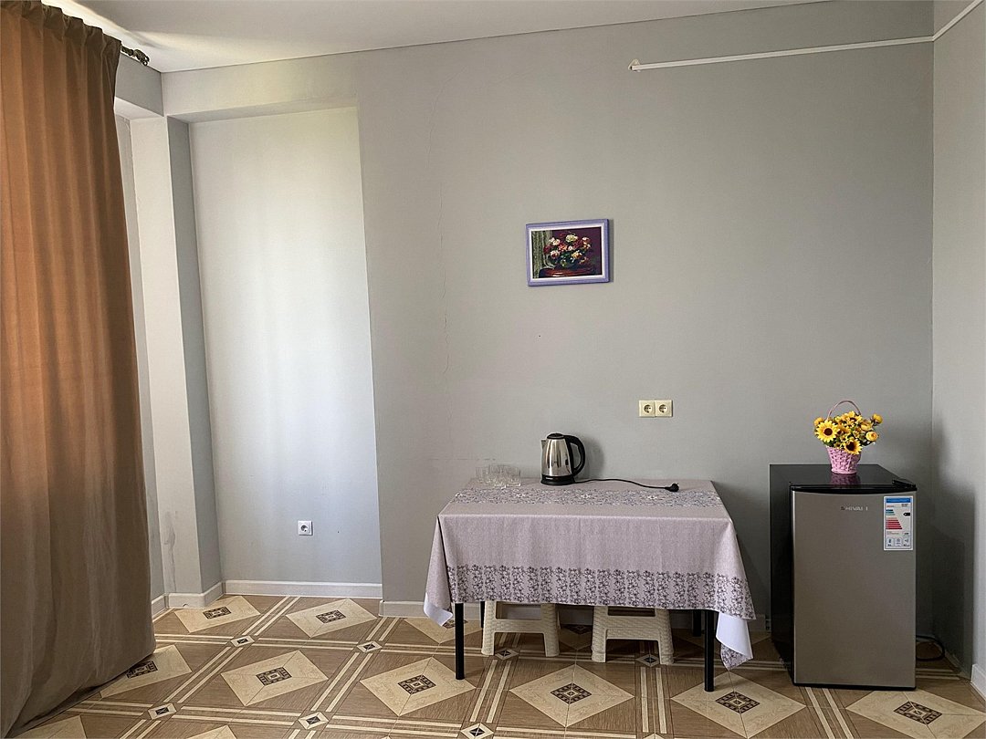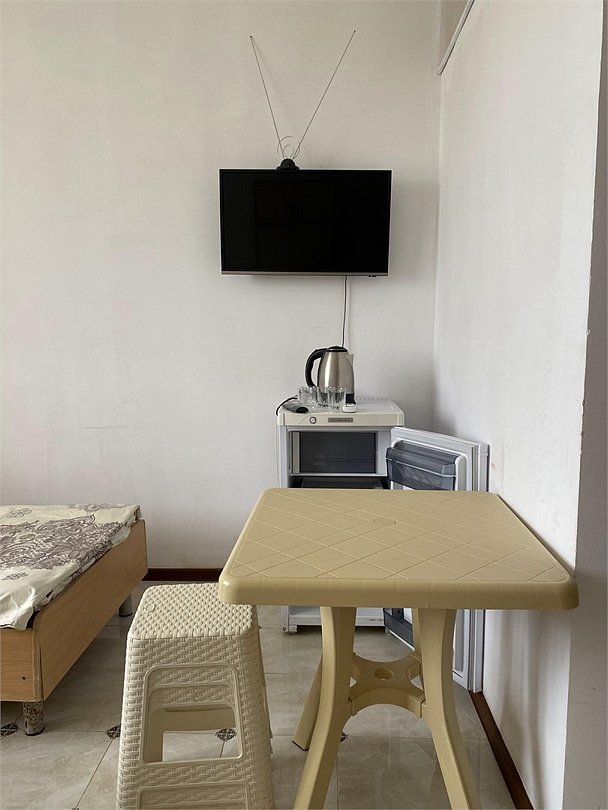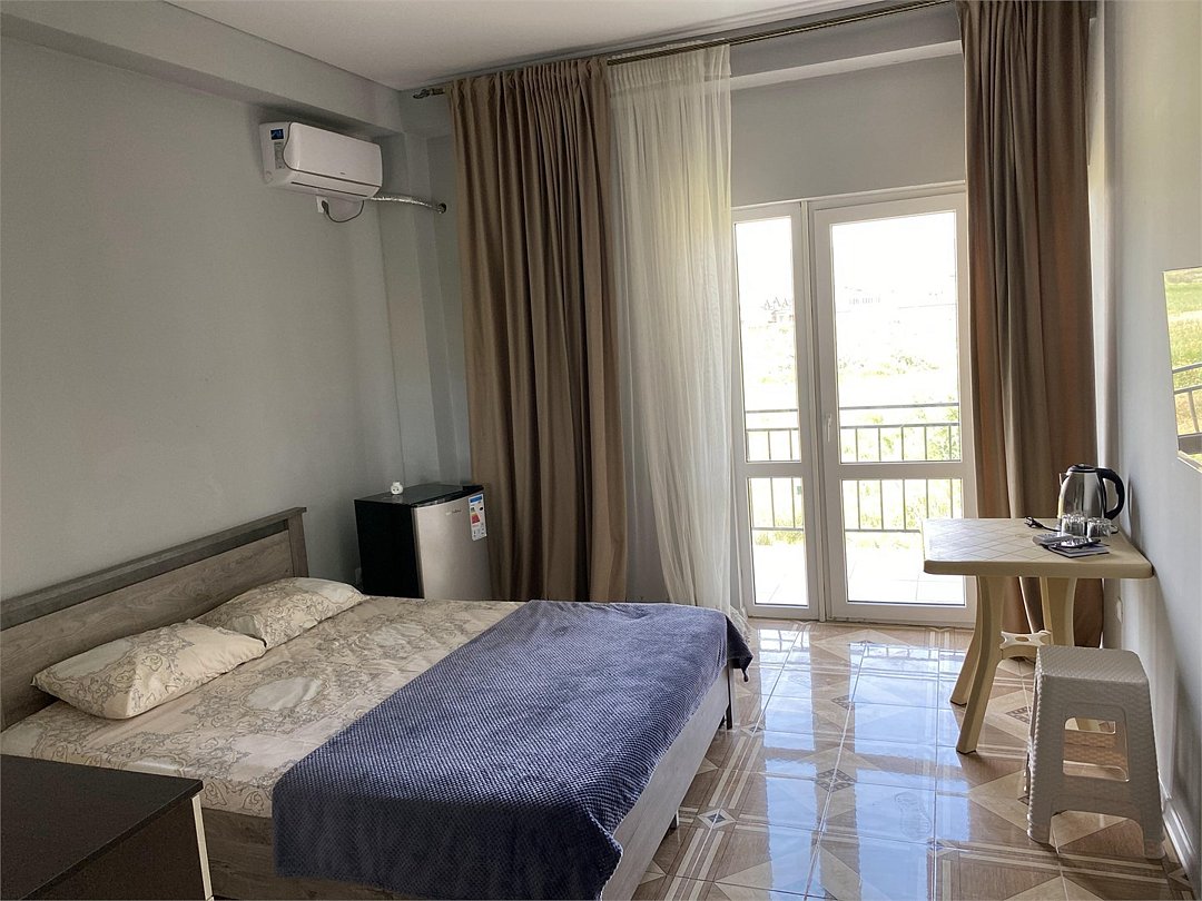 отдельный вход в номер со двора,вид во двор панорамные окна ,все условия в номере душ ,санузел, сплит система ,мини холодильник , телевизор, электро чайник и стол!Услуги и удобства