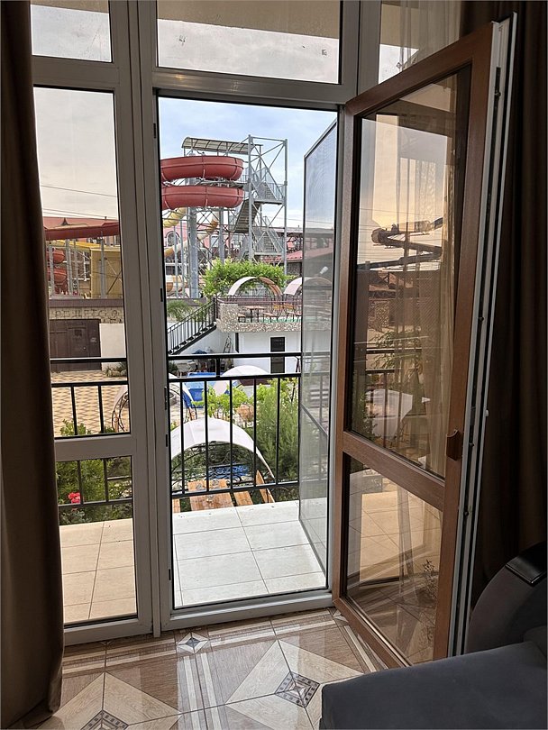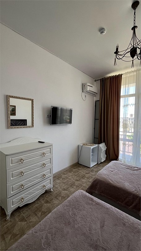 двухкомнатный номер с двумя балконами окна смотрят во двор так же имеется мини кухня, холодильник с морозилкой, электро чайник, раскладной диван, двуспальная кровать , шкаф для одежды. сплит система , ванная и санузел. частичный вид на море.Услуги и удобства