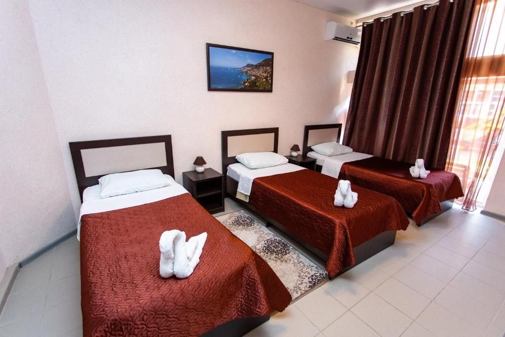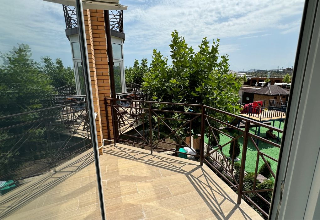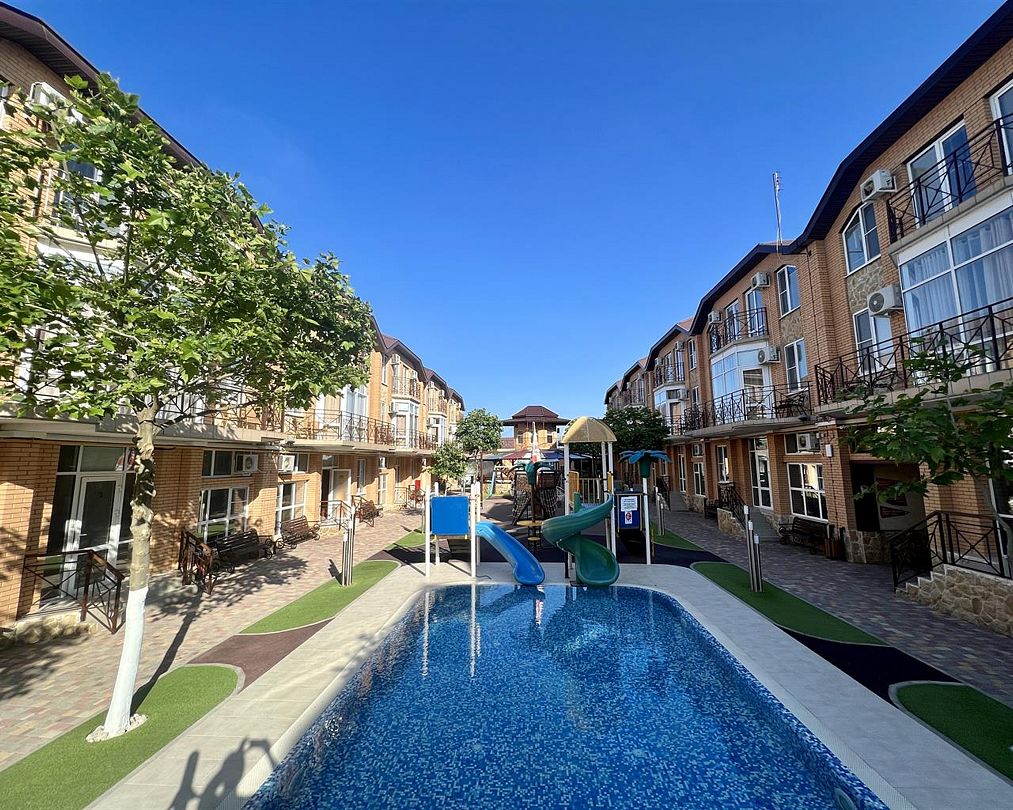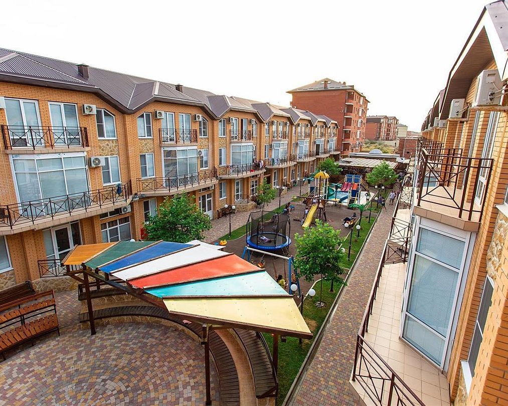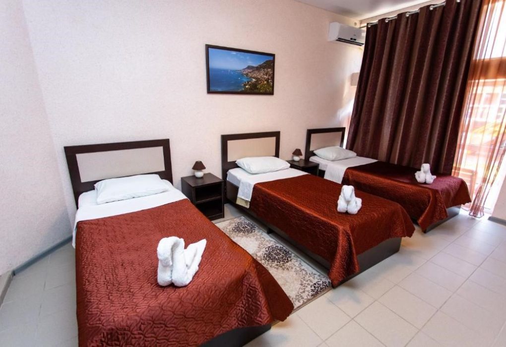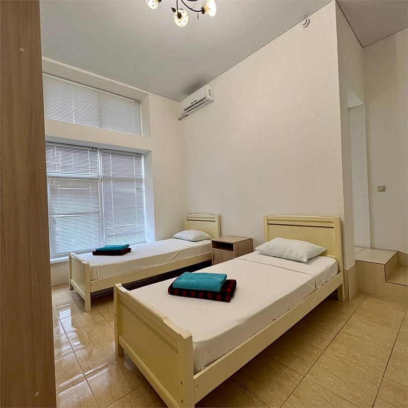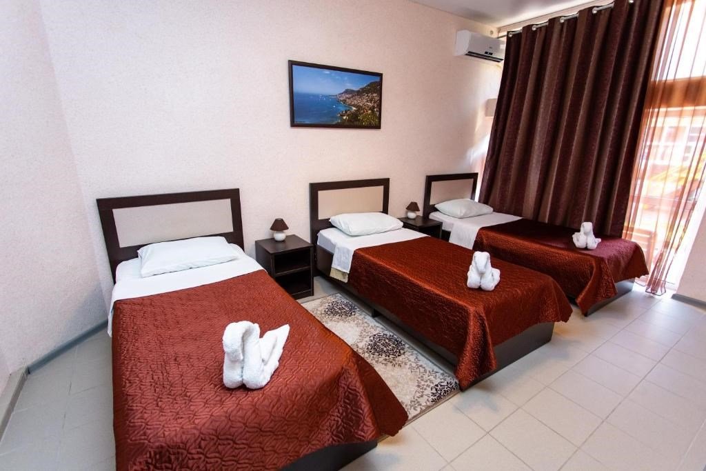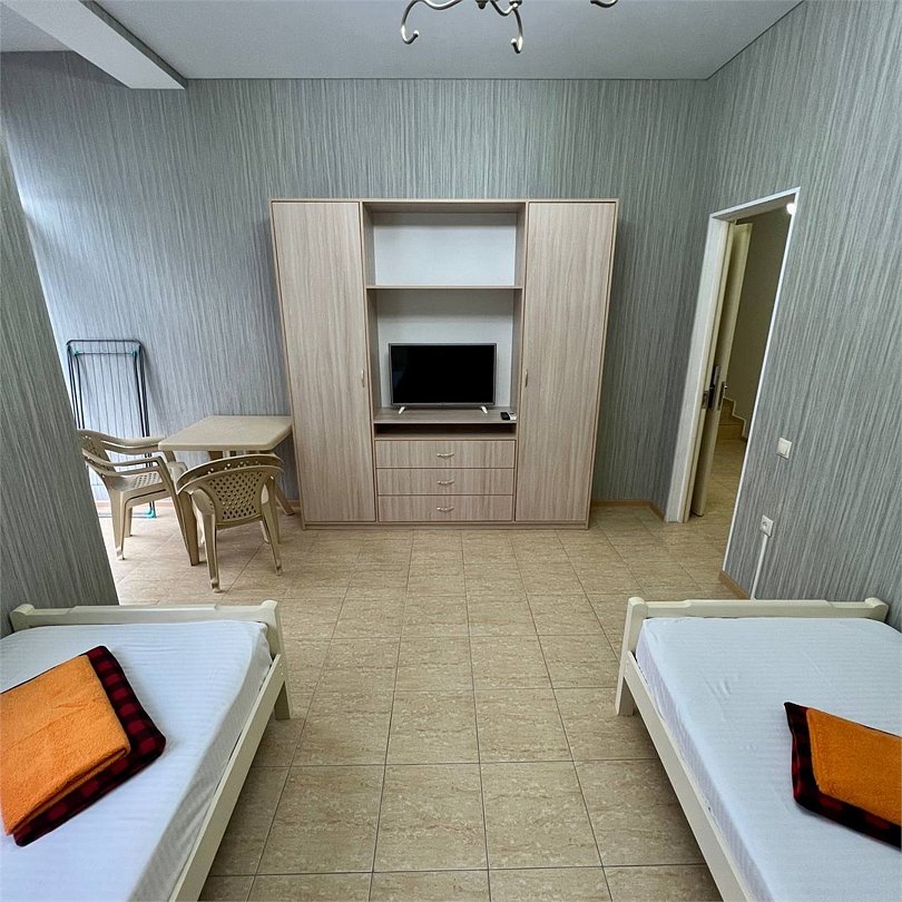 Эти просторные трёхэтажные апартаменты идеально подойдут для больших семей или дружных компаний, ценящих комфорт и личное пространство на отдыхе. На первом этаже находится санузел с душевой кабиной, туалетом и раковиной, а также отдельная спальня с тремя односпальными кроватями – отличный вариант для размещения детей или друзей. На втором этаже расположены уютная гостиная с раскладным диваном и полноценная кухня с плитой, холодильником, кухонным гарнитуром и всей необходимой посудой для самостоятельного приготовления еды. Третий этаж занимает зона отдыха с двумя спальнями: в одной установлена двуспальная кровать, в другой – две односпальные кровати, чтобы каждый гость чувствовал себя максимально комфортно. В апартаментах работает кондиционер, поддерживая приятную температуру на всех уровнях. Вам также доступны фен, полотенца, базовые косметические принадлежности, электрический чайник с чашками и сушилка для вещей. Окна выходят во внутренний двор, создавая атмосферу тишины и уюта. Все гости отеля могут пользоваться бассейнами, аквапарком и участвовать в анимационной программе. До песчаного пляжа Каспийского моря всего несколько минут неспешной прогулки.Услуги и удобства