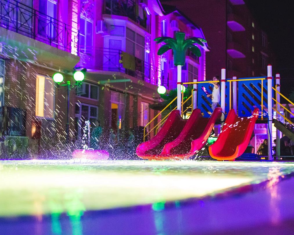 Главный плюс отеля, закрытая территория, и дети сами из нее не могут выйти без карты! Вечерами могли детей 6 и 13 лет отпускать гулять по территории отеля самостоятельно. Помимо детской площадки и горок, есть тренажерный отсек, есть уютные беседки.