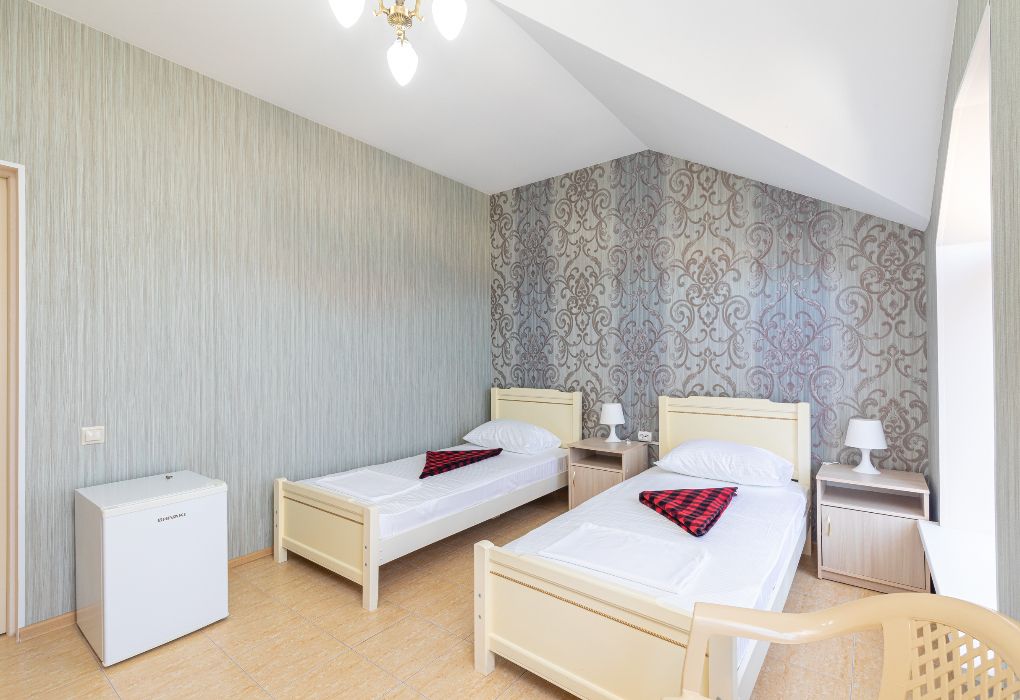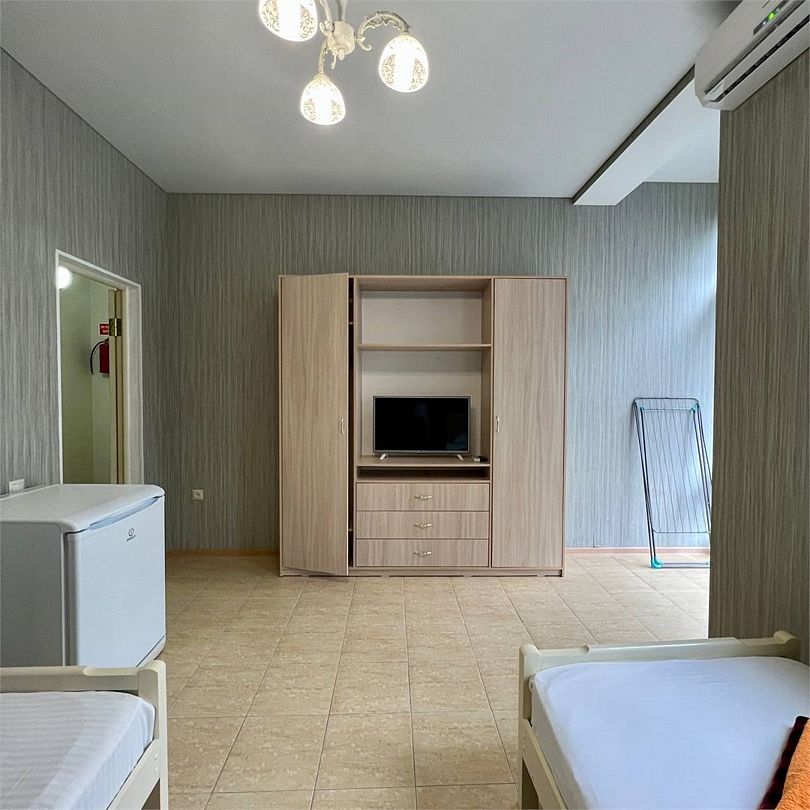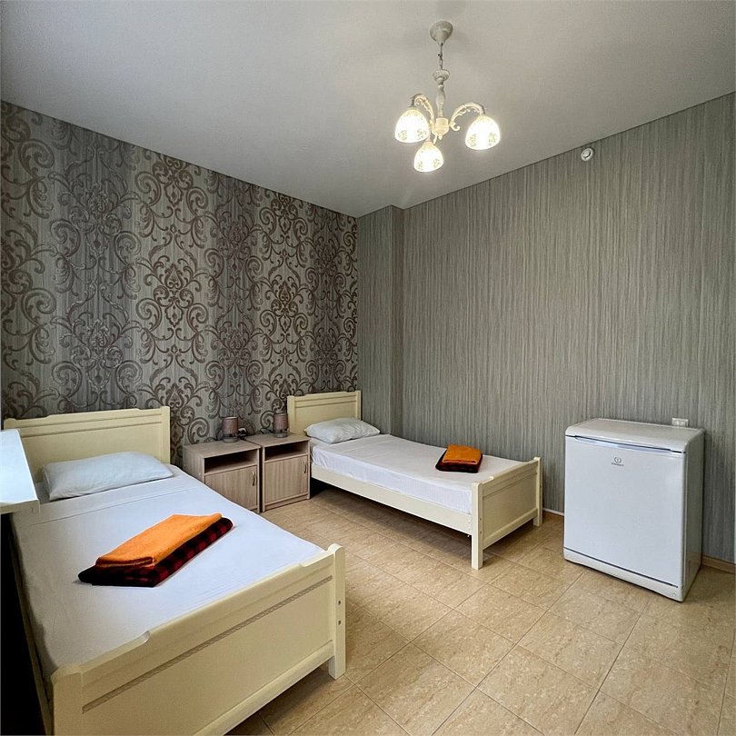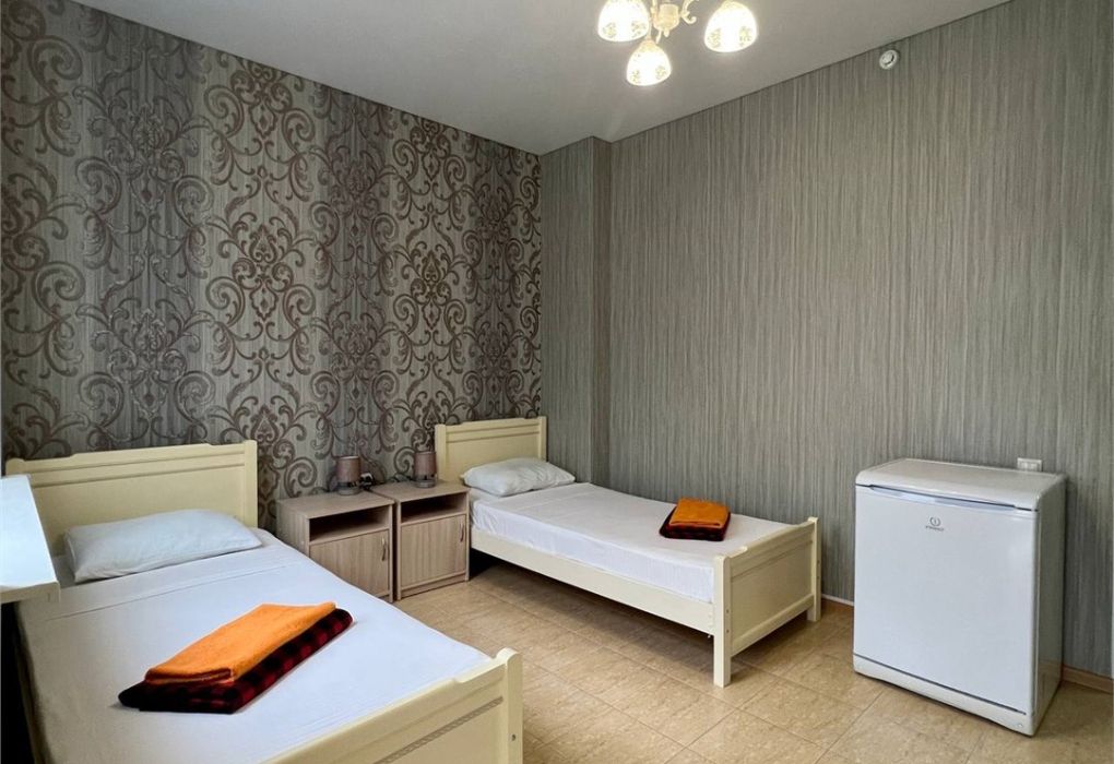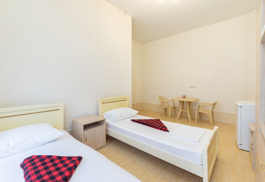 Этот уютный номер создан для тех, кто ценит практичность и разумные траты. Здесь вы найдёте всё необходимое для комфортного отдыха после пляжного дня или экскурсий по Дагестану. Две удобные односпальные кровати и дополнительное место позволят разместиться компании из трёх человек – отлично подойдёт для пары с ребёнком или компании друзей. Ваш санузел с душевой кабиной, туалетом и раковиной расположен прямо на этаже – всего в нескольких шагах от номера. Мы предусмотрели все детали: вам не нужно брать с собой фен или базовые косметические принадлежности. В номере царит приятная прохлада благодаря кондиционеру, а для вечернего чаепития есть электрический чайник с парой чашек. Холодильник поможет сохранить свежесть продуктов и напитков. После моря можно быстро высушить вещи на специальной сушилке. Окна выходят во внутренний двор – вы сможете отдохнуть в тишине, не отвлекаясь на уличный шум. Как и все гости отеля, вы получите доступ к бассейнам, аквапарку и анимационной программе. До песчаного пляжа Каспийского моря 2 – всего несколько минут ходьбы.Услуги и удобства