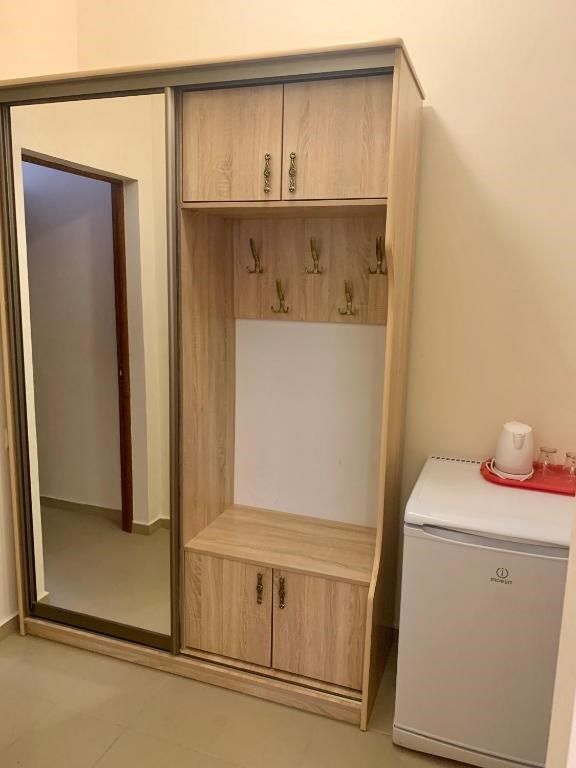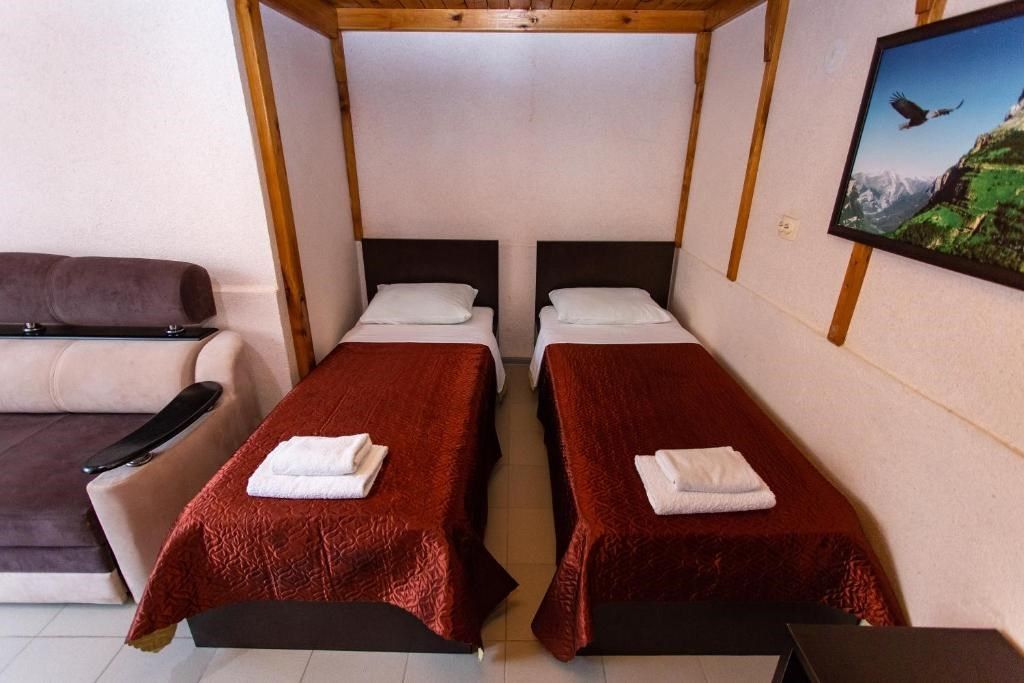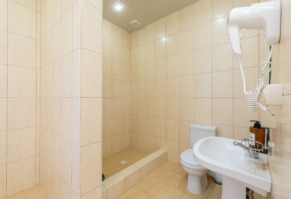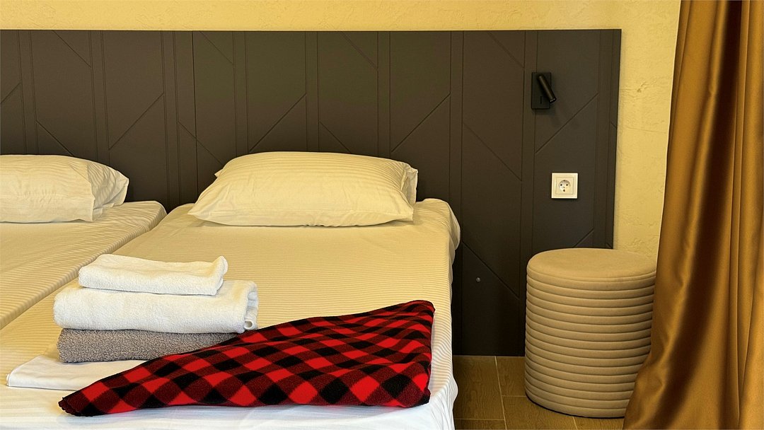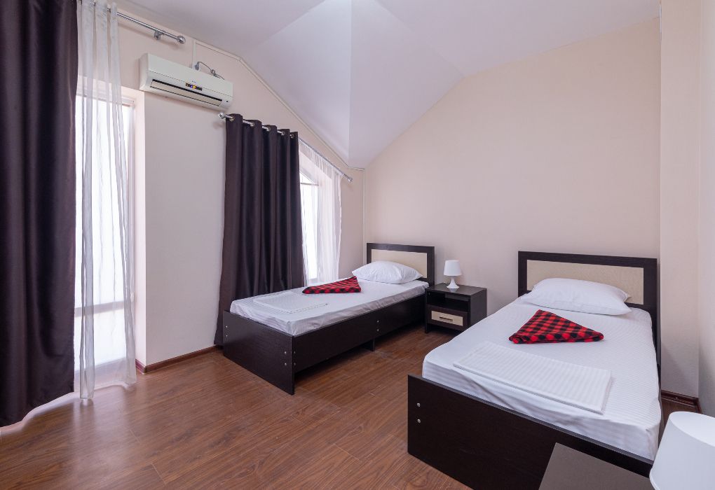 Этот уютный номер создан для тех, кто ценит практичность и разумные траты. Здесь вы найдёте всё необходимое для комфортного отдыха после пляжного дня или экскурсий по Дагестану. Две удобные односпальные кровати и дополнительное место позволят разместиться компании из трёх человек – отлично подойдёт для пары с ребёнком или компании друзей. Ваш санузел с душевой кабиной, туалетом и раковиной расположен прямо на этаже – всего в нескольких шагах от номера. Мы предусмотрели все детали: вам не нужно брать с собой фен или базовые косметические принадлежности. В номере царит приятная прохлада благодаря кондиционеру, а для вечернего чаепития есть электрический чайник с парой чашек. Холодильник поможет сохранить свежесть продуктов и напитков. После моря можно быстро высушить вещи на специальной сушилке. Окна выходят во внутренний двор – вы сможете отдохнуть в тишине, не отвлекаясь на уличный шум. Как и все гости отеля, вы получите доступ к бассейнам, аквапарку и анимационной программе. До песчаного пляжа Каспийского моря 2 – всего несколько минут ходьбы.Услуги и удобства