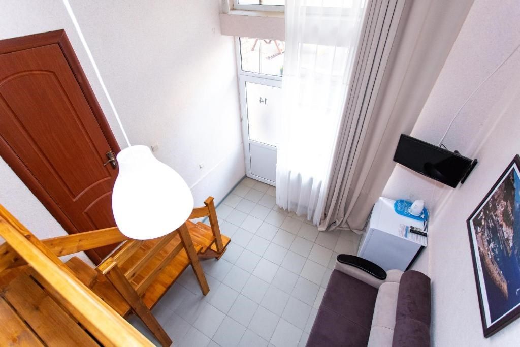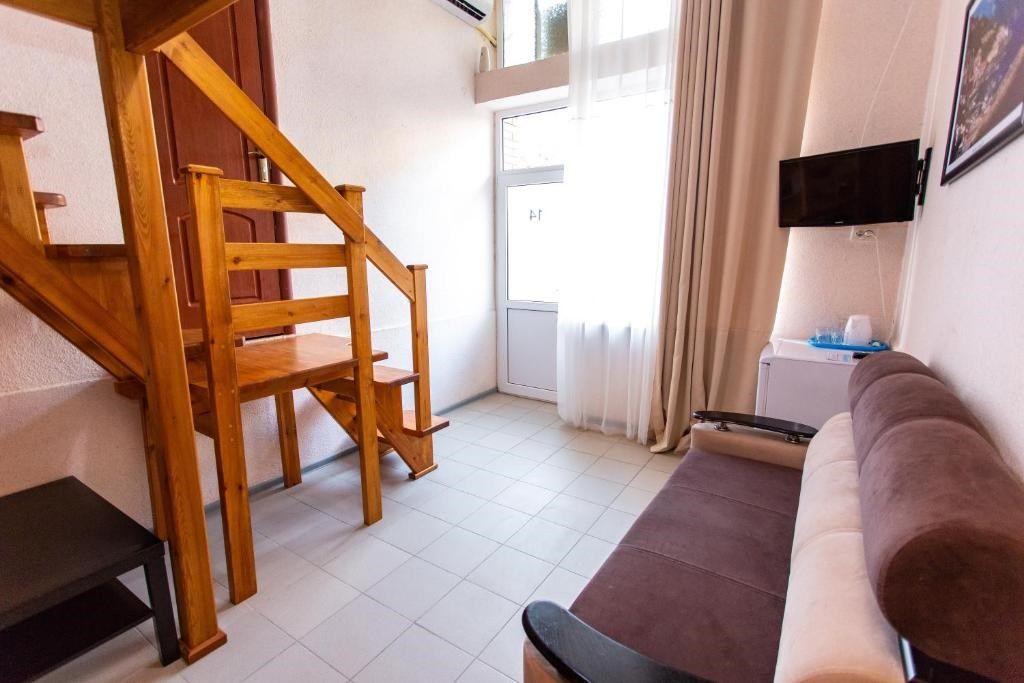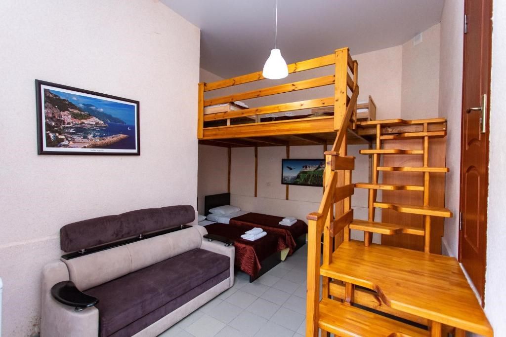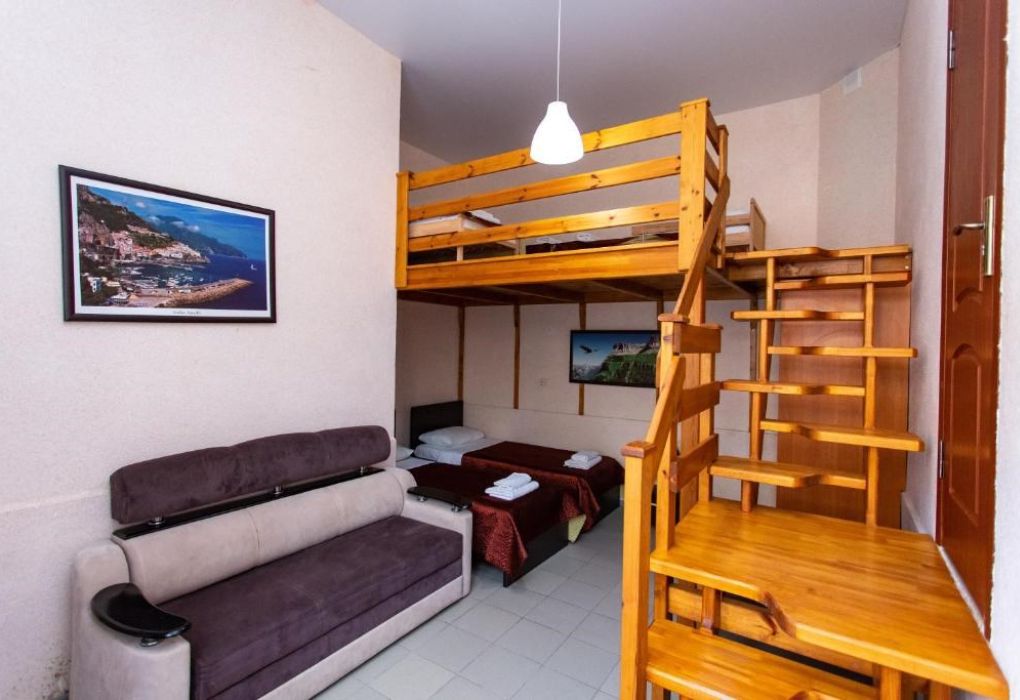 Этот уютный двухуровневый номер создан специально для семейного отдыха, где комфортно будет и взрослым, и детям. Пространство разумно разделено на две зоны: на нижнем уровне расположены двуспальная кровать для взрослых и раскладной диван, идеально подходящий для ребёнка до 10 лет. Лёгкая лестница ведёт на верхний уровень, где обустроены три односпальные кровати для детей. Такой формат позволяет каждому почувствовать себя свободно, сохраняя ощущение единого семейного пространства. В номере есть собственный санузел с душевой кабиной, туалетом и раковиной. Для вашего удобства предоставлены фен, полотенца и базовые косметические принадлежности. Кондиционер поддерживает комфортную температуру на обоих уровнях. В вашем распоряжении также электрический чайник с чашками, холодильник для напитков и закусок и сушилка для быстрой сушки пляжных вещей. Окна выходят во внутренний двор, создавая атмосферу уединённого отдыха. Все гости нашего отеля могут свободно пользоваться бассейнами, аквапарком и участвовать в анимационной программе. До песчаного пляжа Каспийского моря – всего несколько минут неспешной прогулки.Услуги и удобства